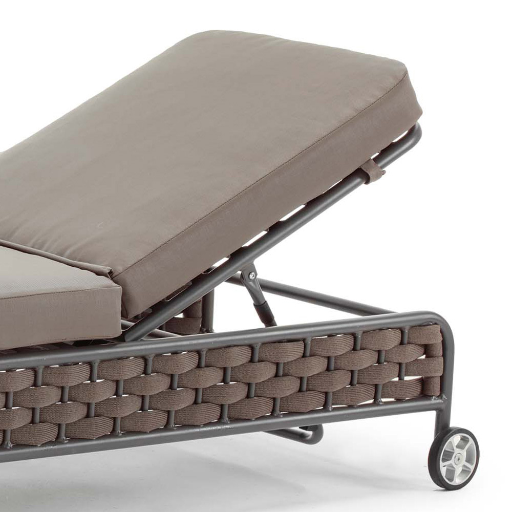 Garden chaise longue with internal structure in anthracite painted aluminum wrapped in an elegant weave in brown finish polyester rope and removable cushions in water-repellent rubber covered in brown-colored acrylic fabric .