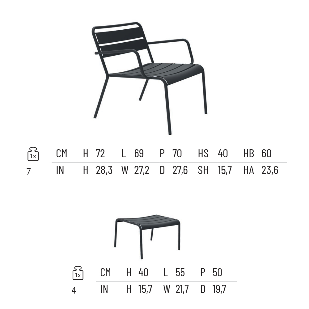 - chaise longue : L 69 x D 70 x H 72 cm;