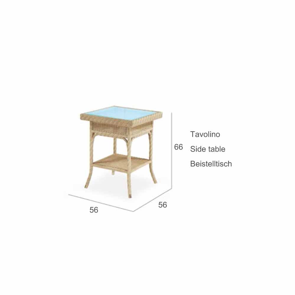 Outdoor coffee table with aluminium frame covered with 3 mm thick round polyethylene and 7 mm thick flat polyethylene, available in the shades coffee, white and honey. With glass top.
