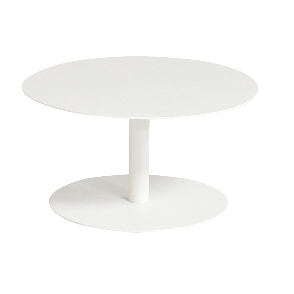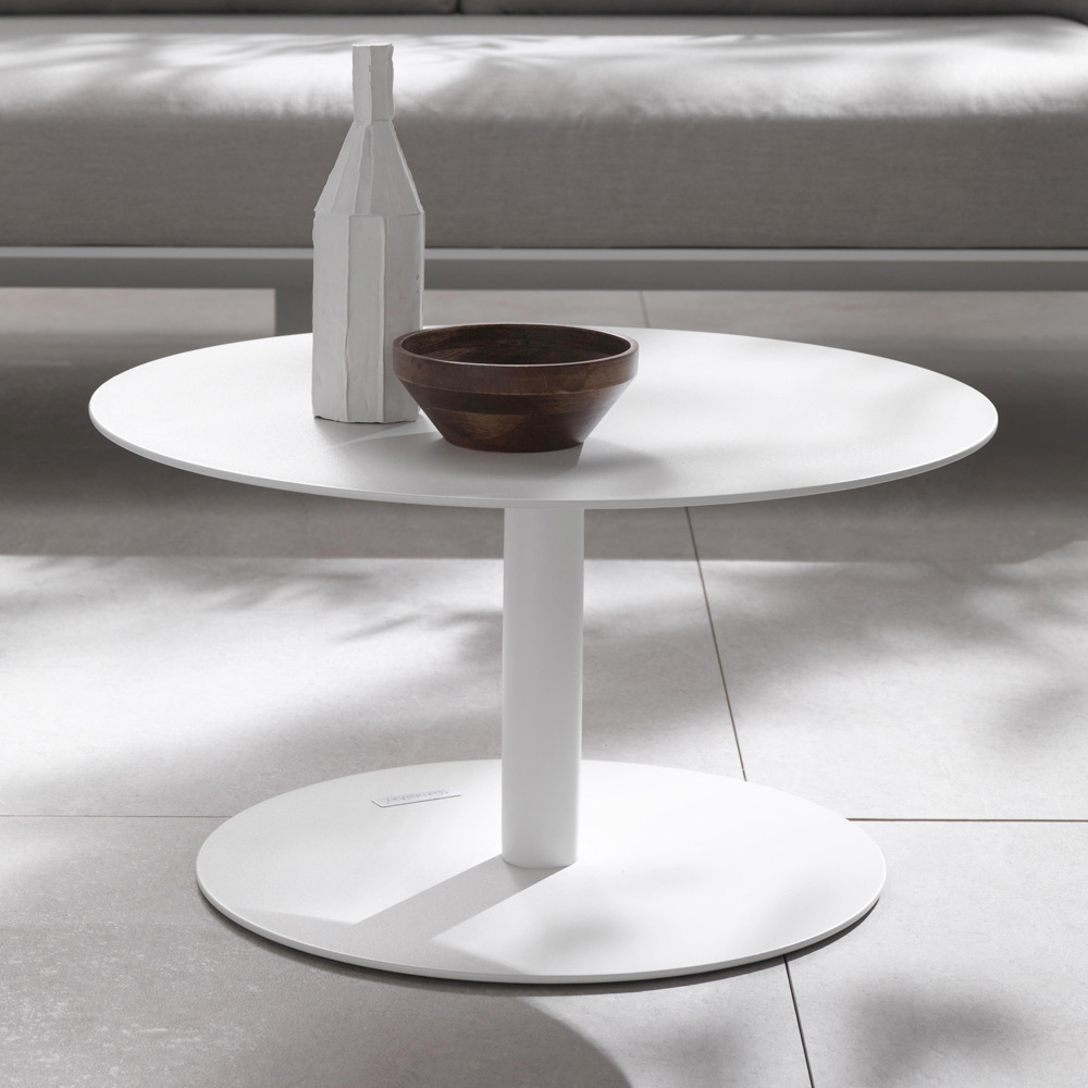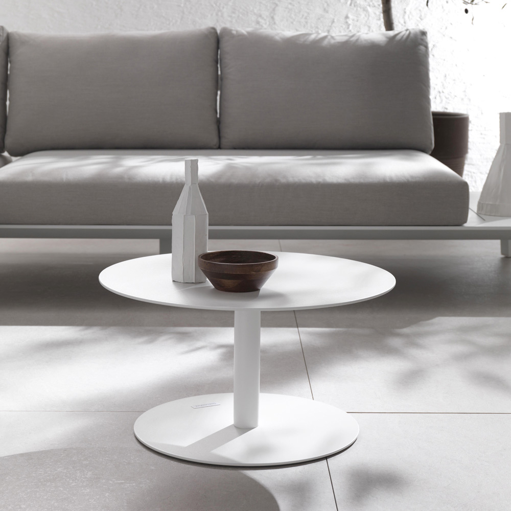 Side table for the garden made up of a top and structure in aluminumpainted with epoxy powders in white. Characterized by a soft, linear and simple design, this coffee table is perfect for furnishing any outdoor environment such as terraces, swimming pools and gardens, while at the same time finding its place in the various indoor living areas as a functional support point.