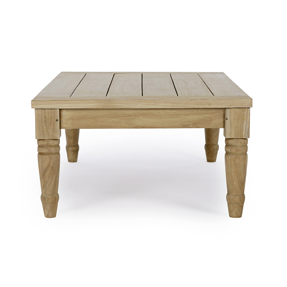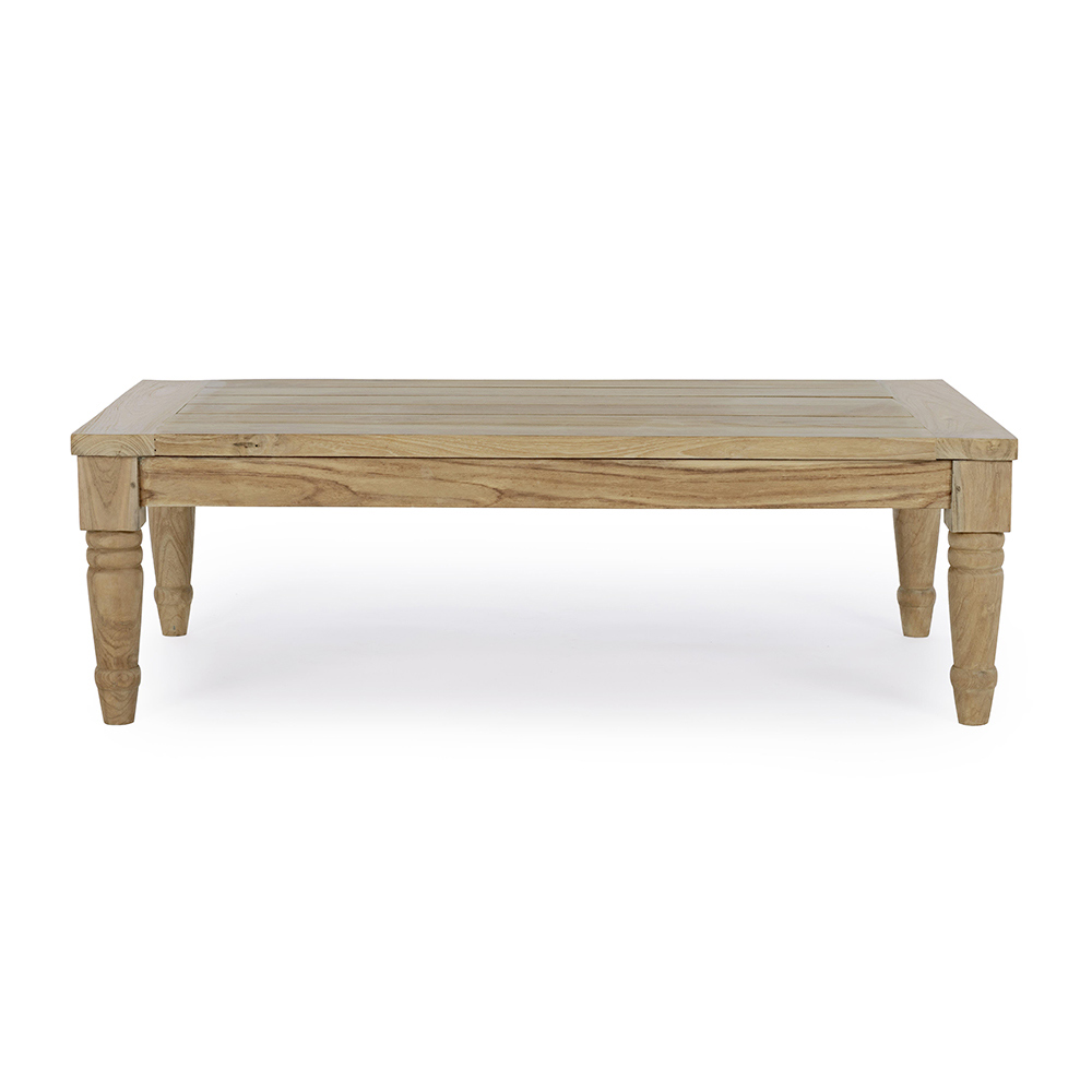 Rectangular outdoor coffee table in teak wood with rustic finish.
