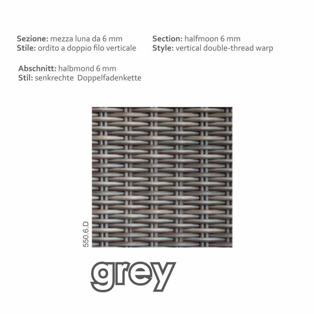 Aluminium frame covered with handwoven polyethylene, available in the colours grey/taupe (6 mm).
