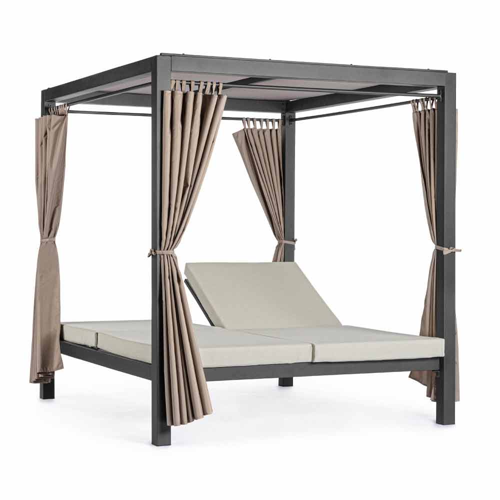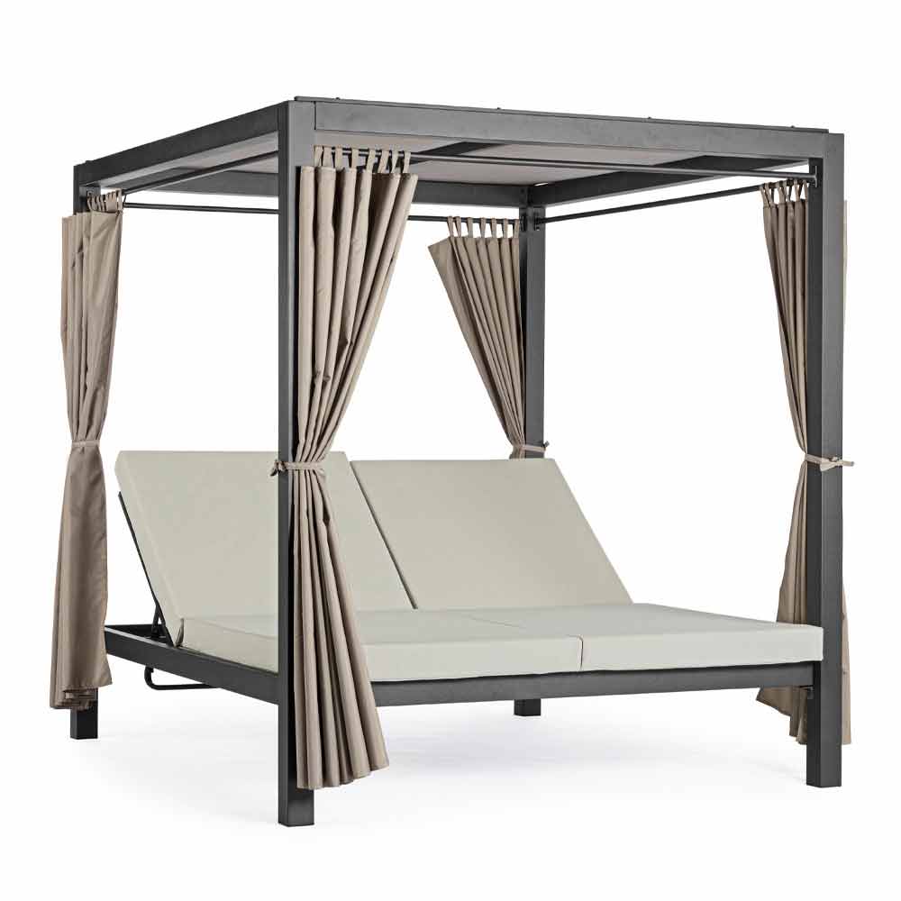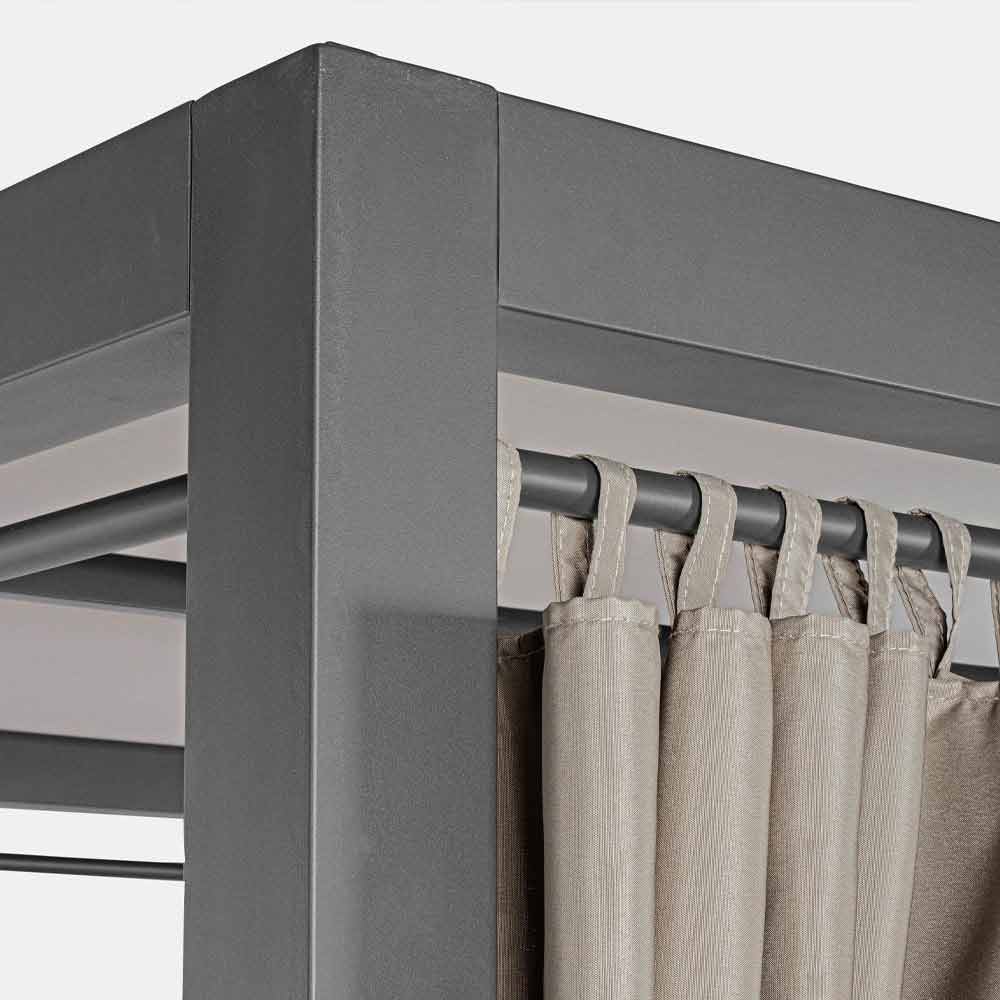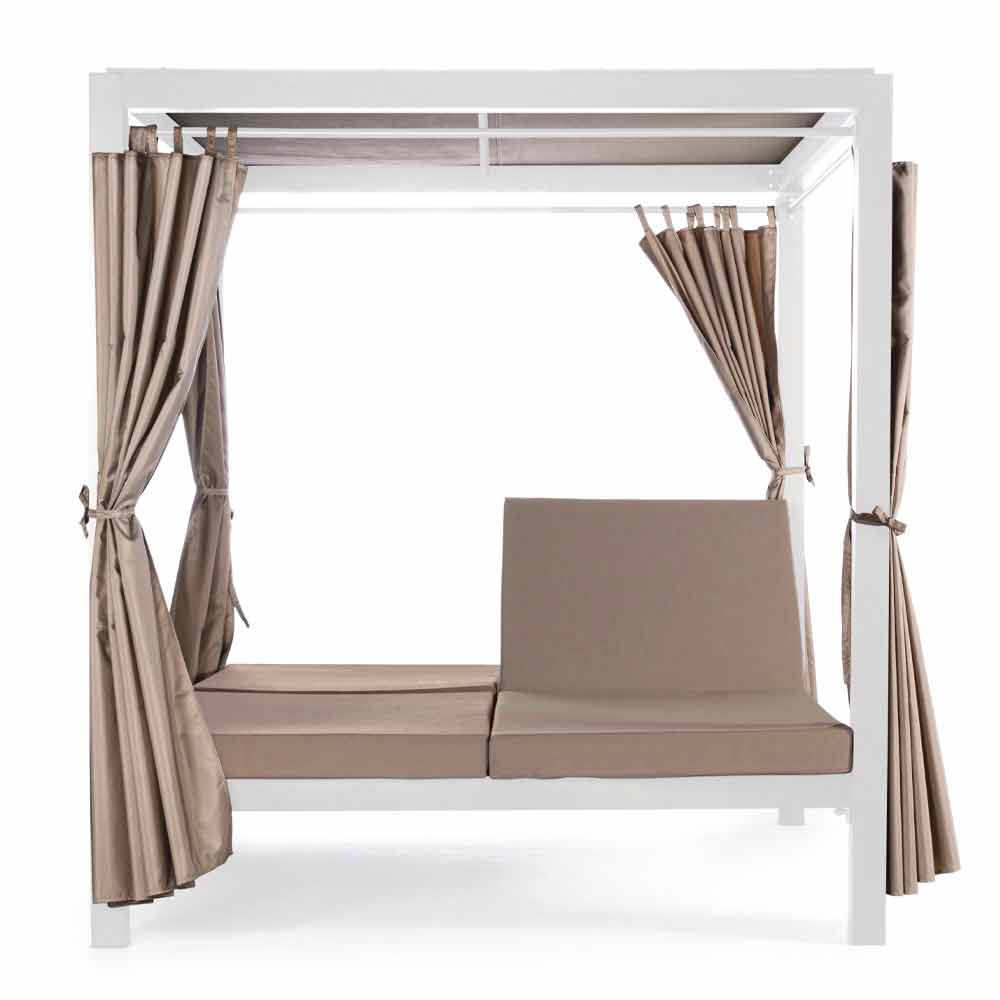 Powder coated aluminum structure, 80x80mm poles, roof cloth and seat cushions (removable) in 1x1 textilene , fast dry foam padding for outdoor use. 4-position reclining backrests and polyester side curtains. To be assembled.