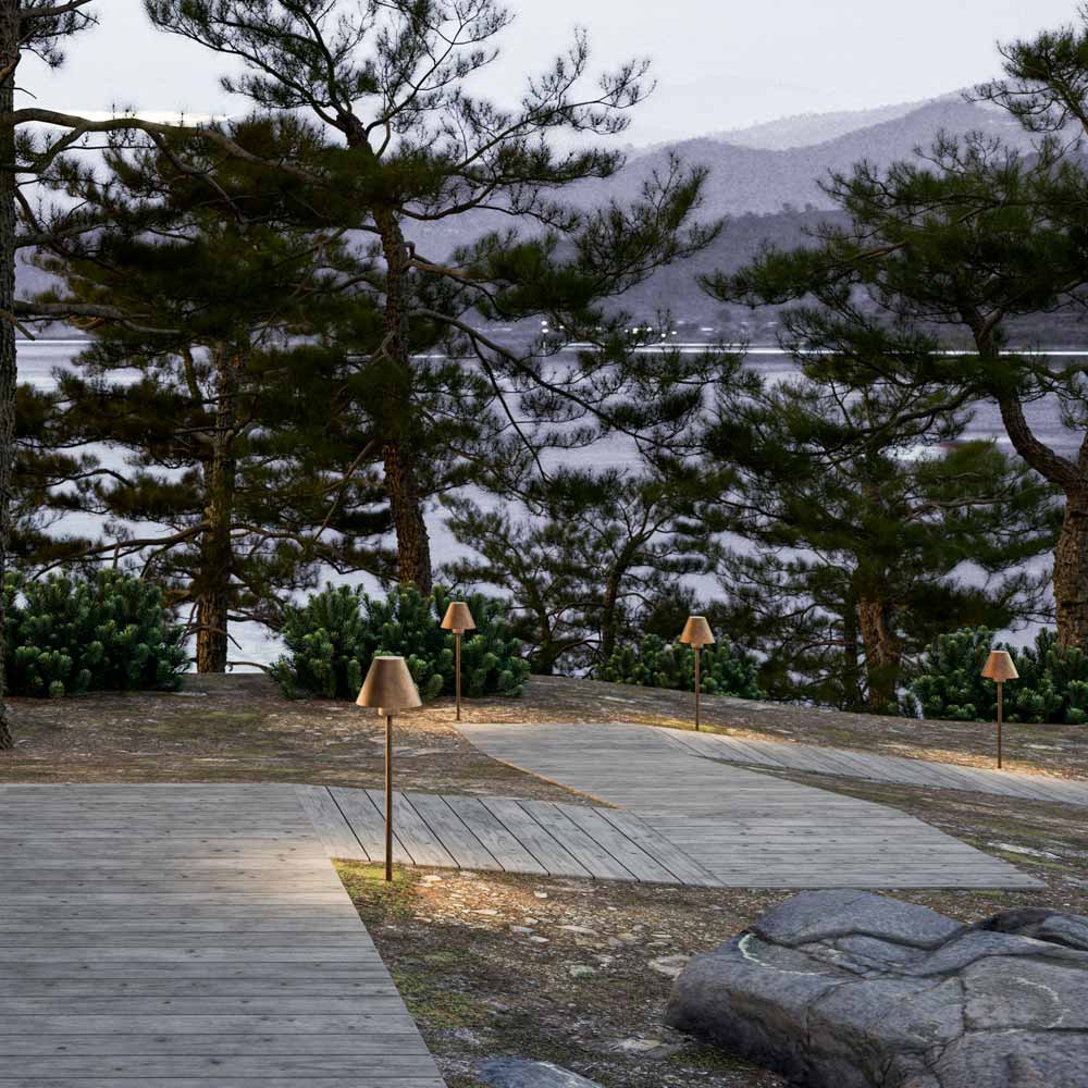 The collection of outdoor lamps was born from the desire to bring the characteristics of interior design to products intended for the outdoors, to create welcoming and familiar atmospheres even in the open air. With lines inspired by Nordic aesthetics, the floor or wall lamps are made of brass and copper.