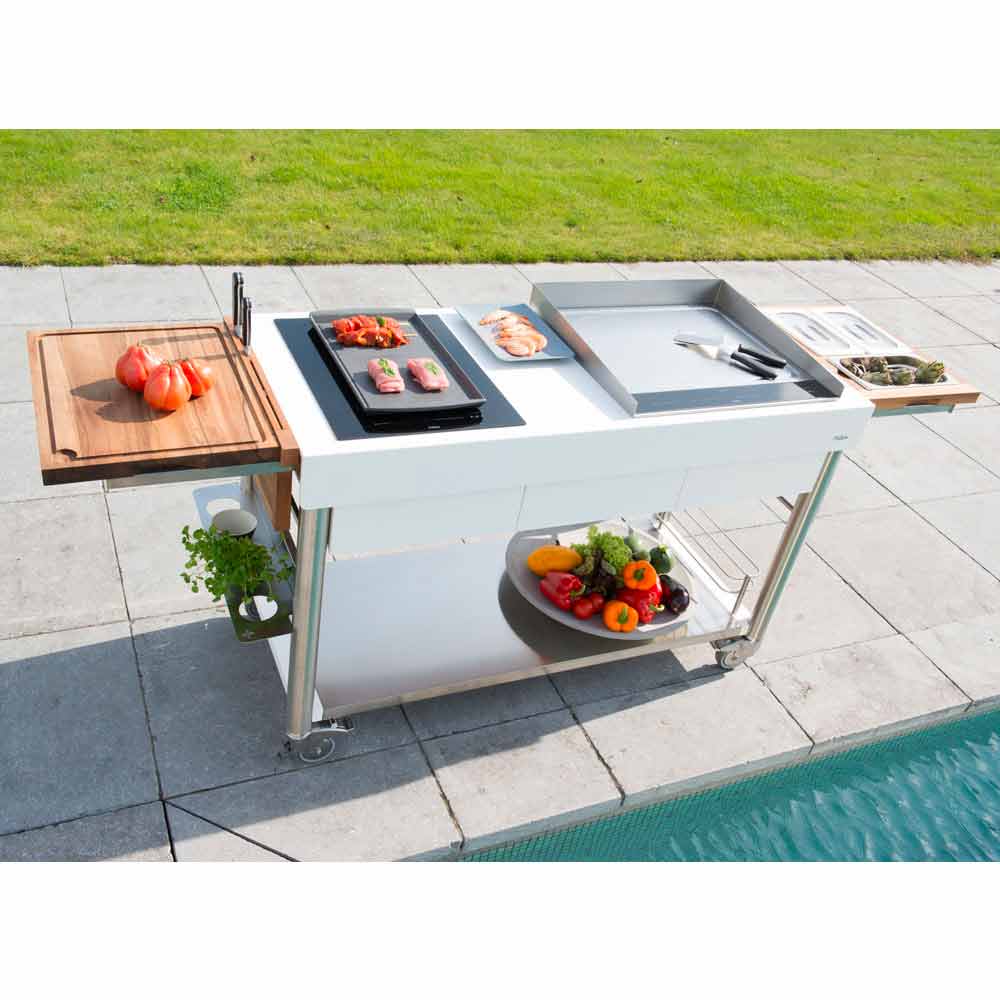 Outdoor kitchen on wheels in stainless steel and teak wood with interchangeable plates, two sizes available, modern design, high quality.