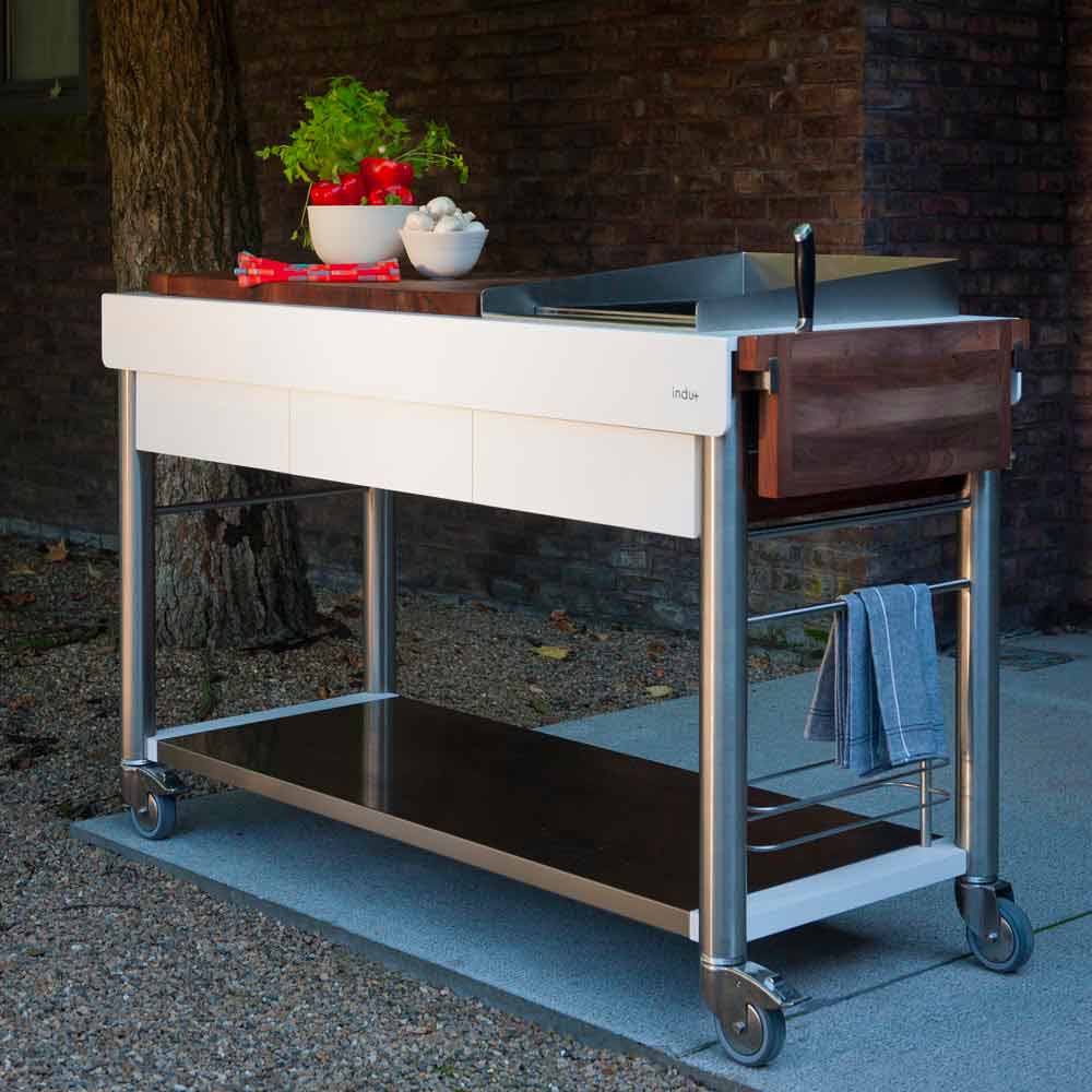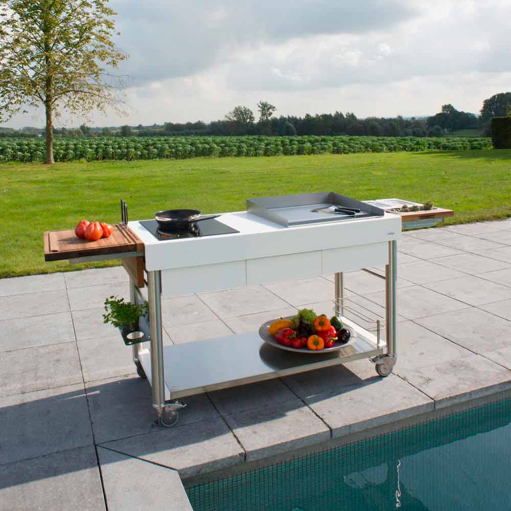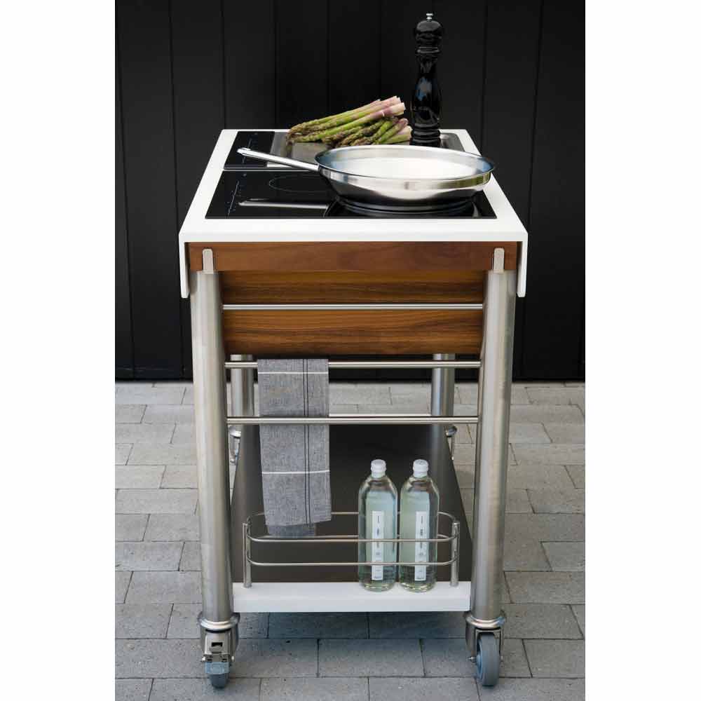 It is an outdoor kitchen on wheels characterized by a robust structure that uses brushed stainless steel, finishes and top of high quality composite with solid wood trim Walnut, you can place where you prefer: in the garden, on the terrace or poolside , for a luxurious and trendy effect.