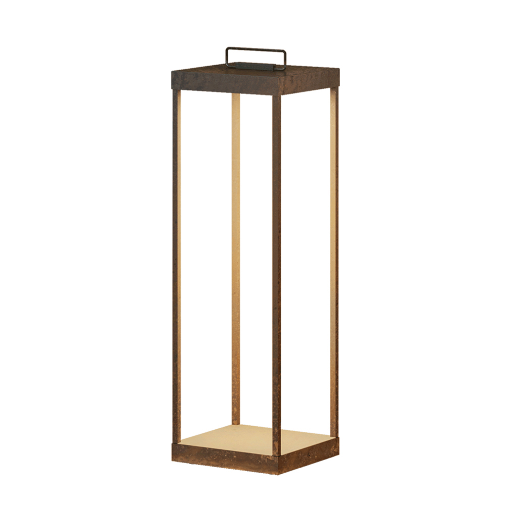 Outdoor lantern made of antique brass with triac dimmer LED light and handle on the top entirely Made in Italy. Non-removable lamp with fixing to the ground. Like treasure chests of light that illuminate the surrounding environment, preserving its intimacy and creating a sophisticated atmosphere, the lanterns in the collection are characterized by discreet and elegant lines. The antique brass structure makes them ideal even for the most natural contexts.