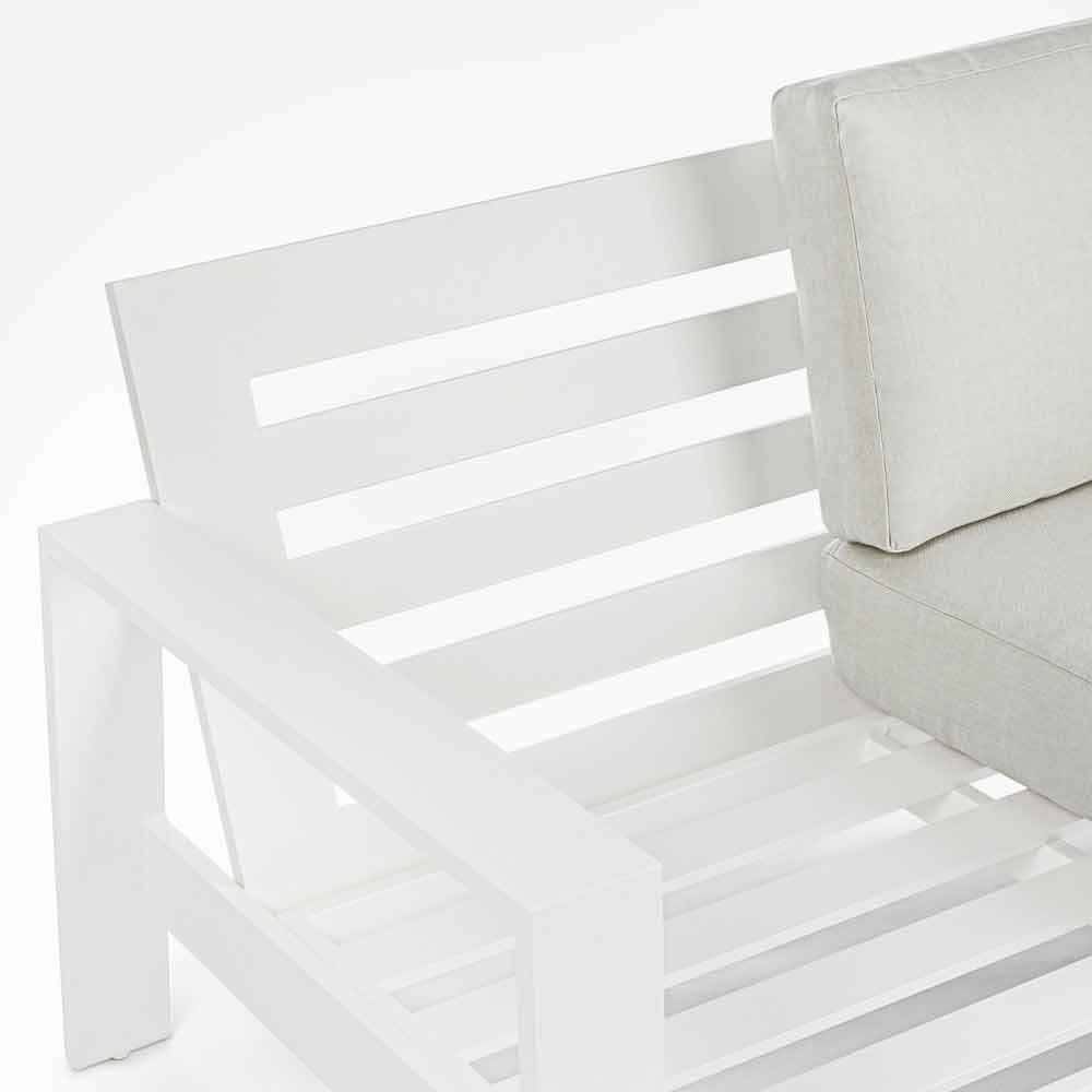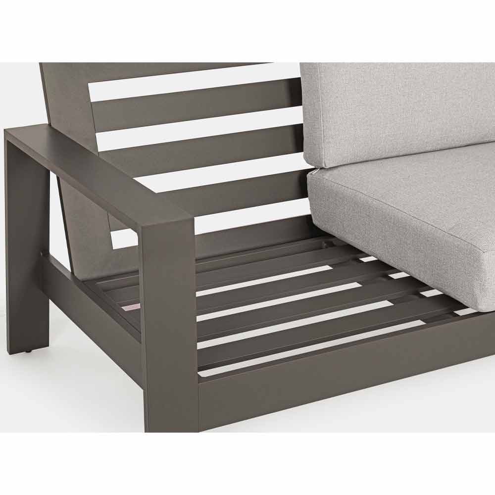 Powder coated aluminum structure (polyester). Seat and back cushions with removable covers with olefin fabric (100% polypropylene). Adjustable feet. Stainless steel screws. To be assembled.