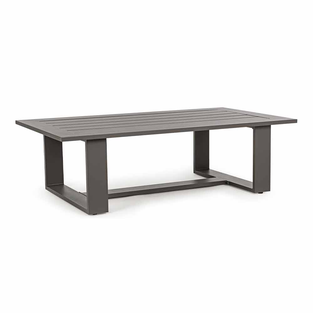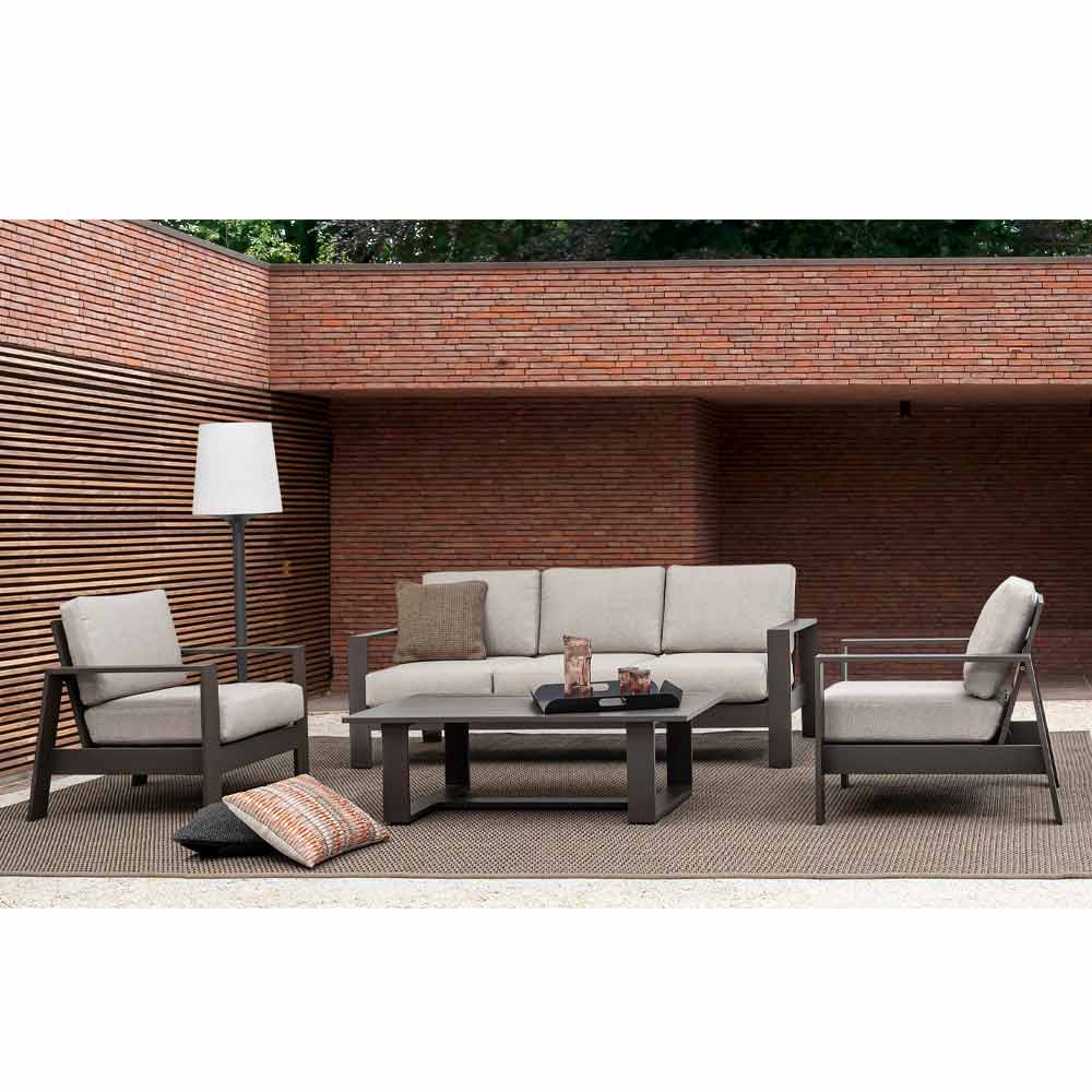 Outdoor lounge with sofa, armchairs and aluminum coffee table.