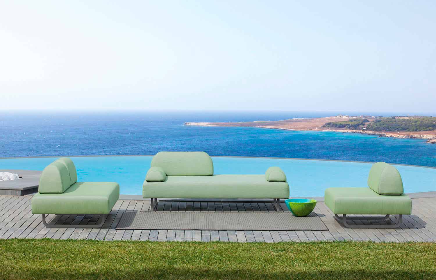 Outdoor living room composition characterized by a design halfway between retro and futuristic composed of a two-seater sofa, a three-seater sofa and an armchair. Each of these products has a resistant wooden internal structure and padding sealed with 100% dyed acrylic fabric for outdoor use,