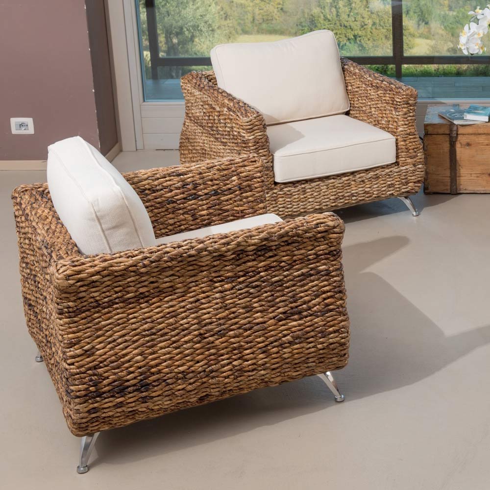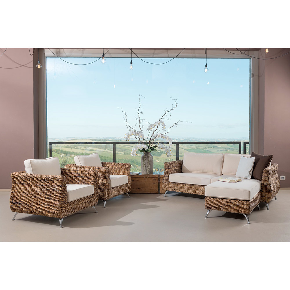 The living room belongs to a whole collection which stands out for its modern tones both in the design of the seats and in the detail of the aluminumlegs . At the same time, however, it is animated by the warmth of the natural weave , handmade using a refined natural banana braid. The products in this collection are suitable for furnishing sheltered outdoor spaces such as porches, balconies, terraces, verandas and gazebos, enlivening the environments with unique warmth and style. They are also suitable for any interior environment .