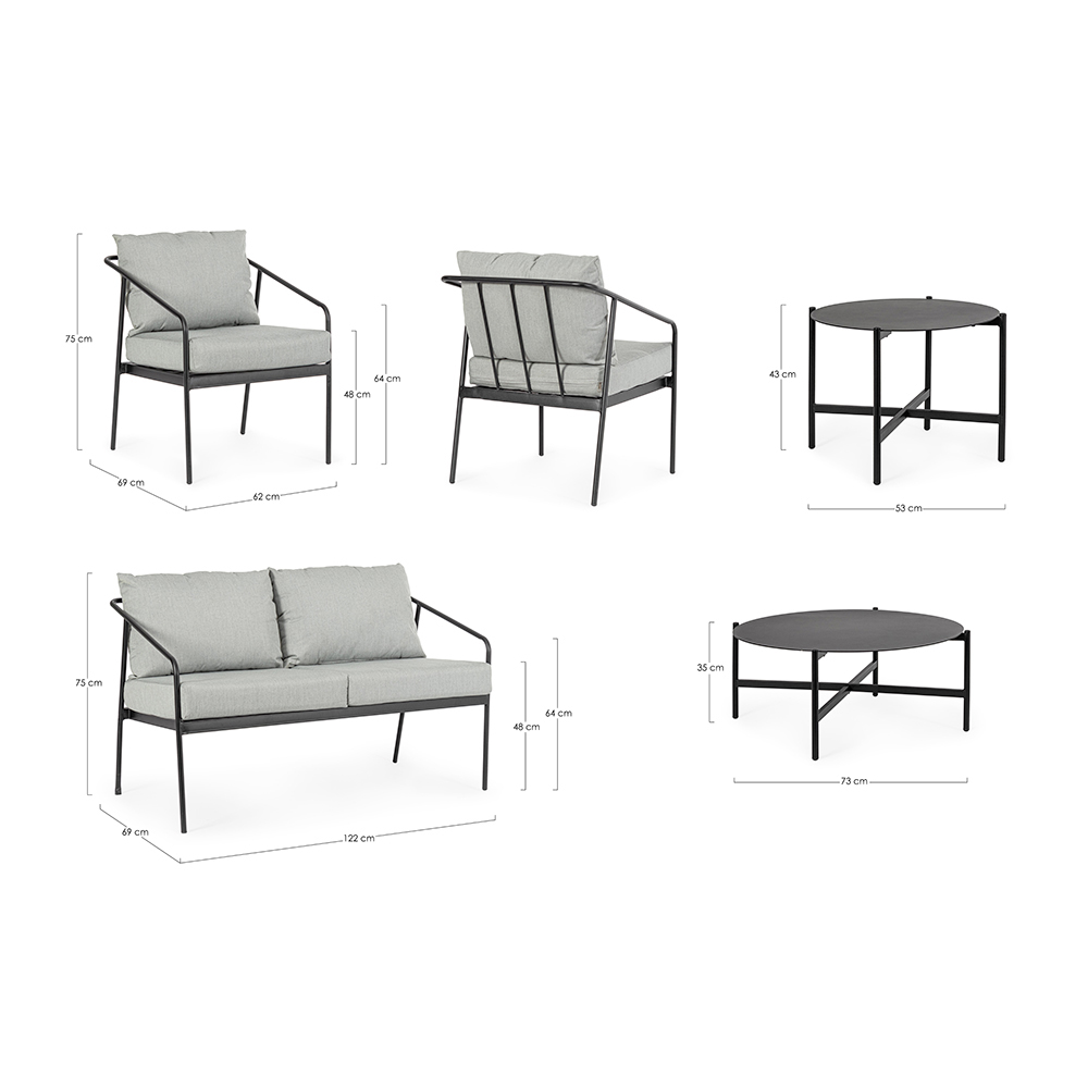 This garden lounge set is a true ode to modern design and outdoor comfort . Each piece, from the single armchairs to the two-seater sofa , has been designed to offer an unparalleled relaxation experience, thanks to the soft seat and back cushions they adapt to any landscape or style of outdoor furniture. The steel structure is robust and designed to resist over time, but the sinuous shape gives the set a visual lightness that enhances the environment without weighing it down.