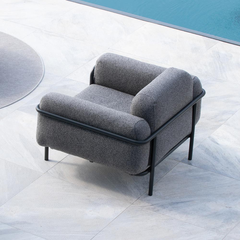 Outdoor lounge entirely made in Italy complete with sofa and 2 armchairs covered in 100% polypropylene fabric with powder-coated galvanized iron structure. A furnishing solution characterized by solid lines and rounded corners that envelop and welcome like a warm embrace. Ideal for designing spaces with a contemporary charm , this garden composition features large seats and soft profiles highlighted by a geometric structure with a minimal aesthetic .