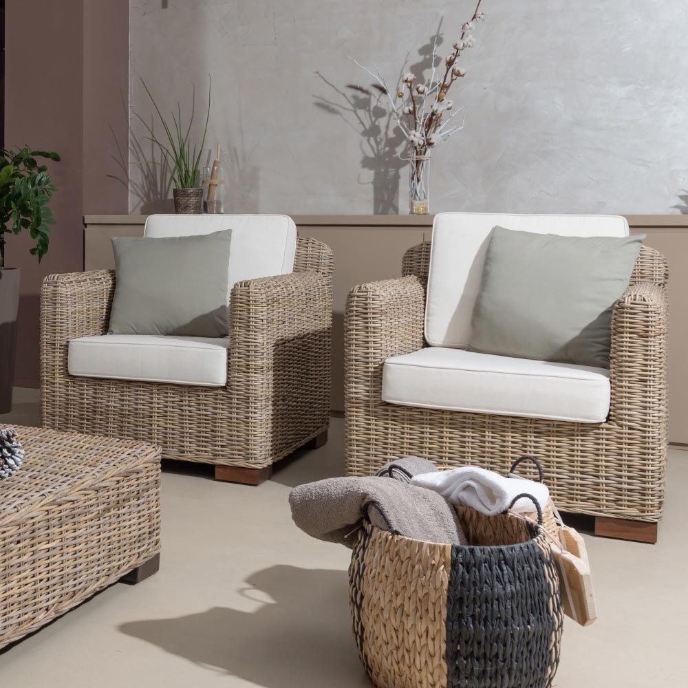 Outdoor lounge set consisting of 2armchairs , 3-seater sofa and pouf-table in hand-woven grey kubu with standard cushionsincluded in the standard " Ecru " finish .