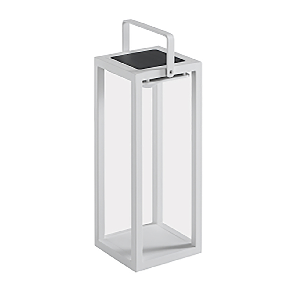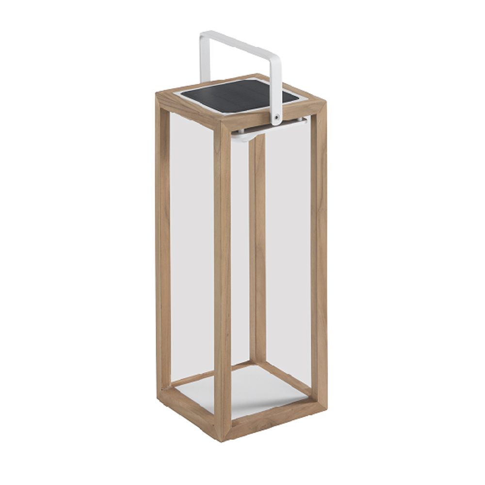 Outdoor solar lantern made of painted aluminum or teak available with white structure and white handle or with teak structure and white handle. The light of the lantern is given by solar modules that recharge themselves in the sun or a charger with a wall socket is provided, useful for recharging the solar module.
