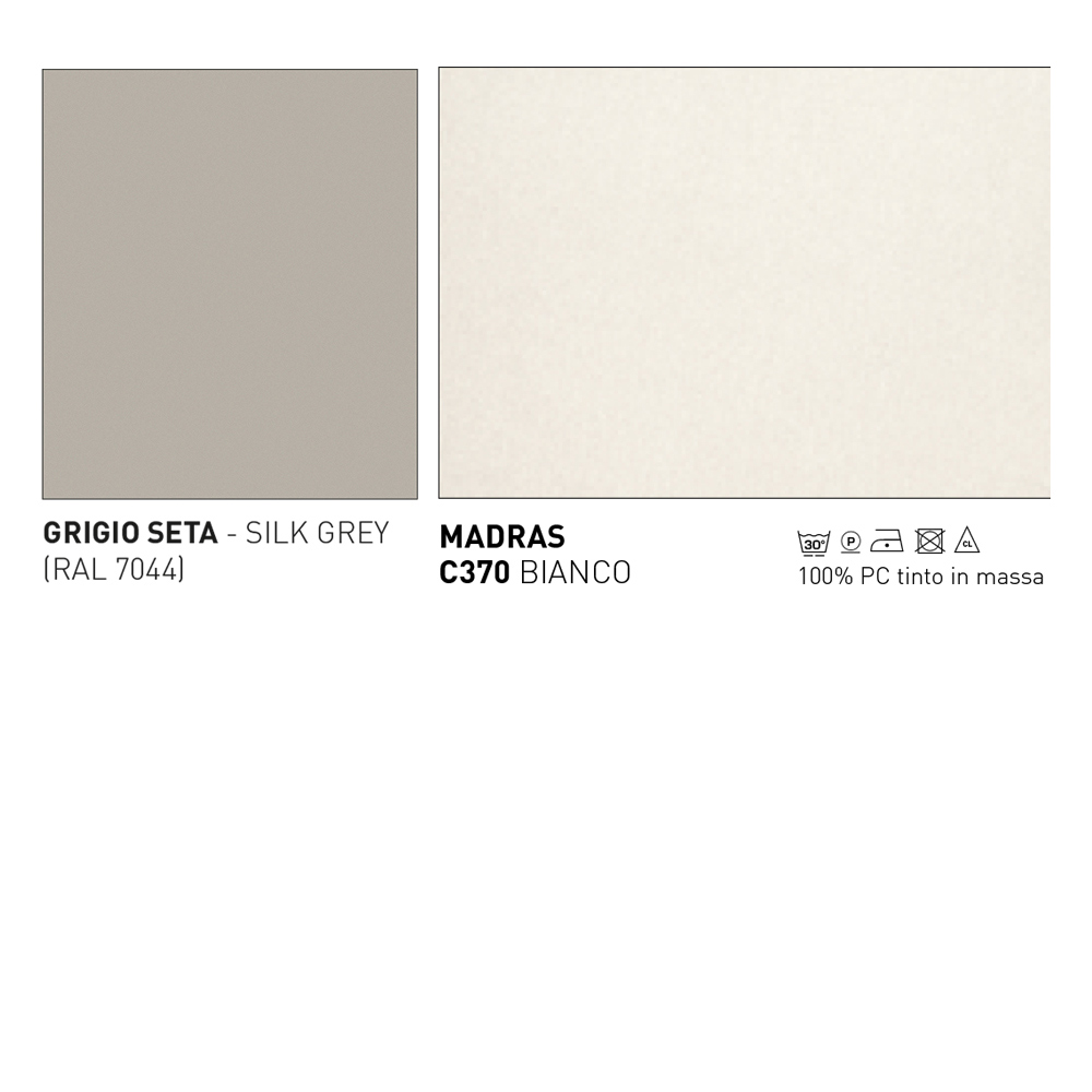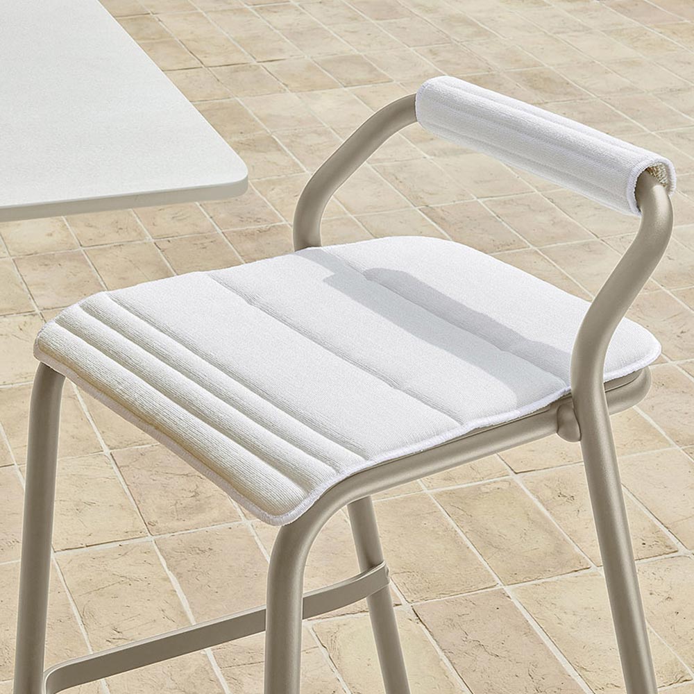 Outdoor stool entirely made in Italy with structure in epoxy powder coated aluminum tube in silk gray finish and seat complete with white seat and back cushions padded with dryfeel rubber . This modern piece of furniture is designed to offer optimal comfort while helping to complete the outdoor environment thanks to its elegant aesthetics .