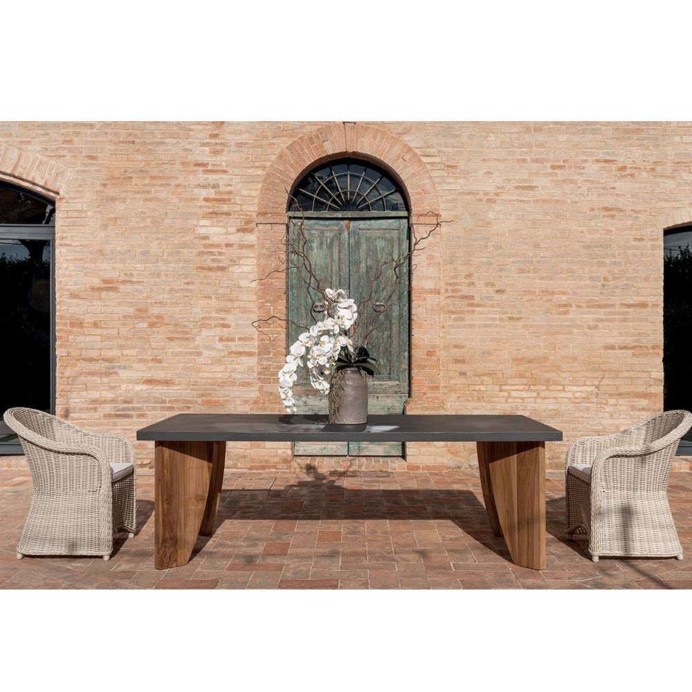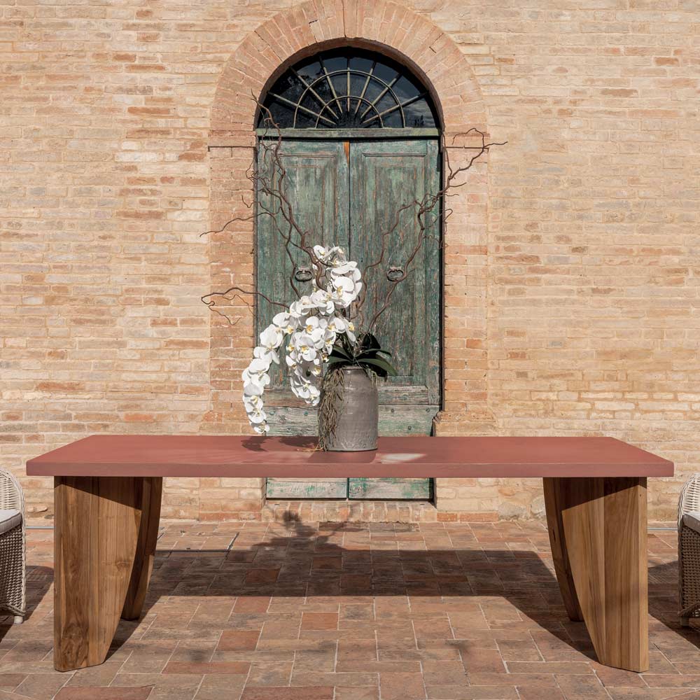 This table is a perfect combination of elegance and solidity, a designer piece that fits perfectly in both indoor and outdoor settings. Its