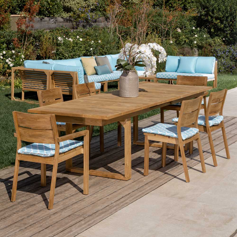 Extendable garden table to 270 cm in teak wood with a natural brushed finish.