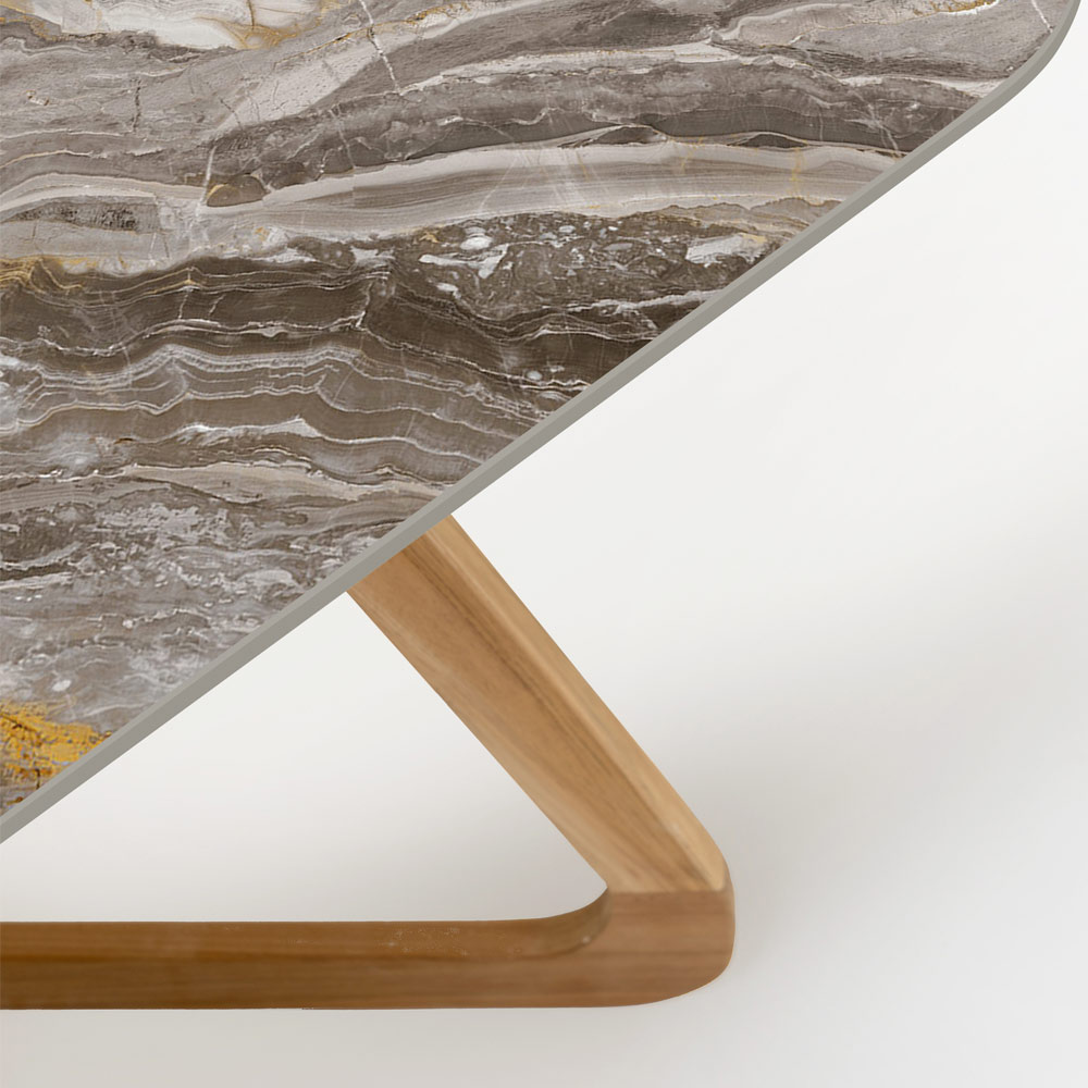 Made in Italy. This outdoor table is a marvel of design, combining the strength of wood with the opulence of ceramic, inspired by Orobico Luxe marble . This ceramic top, with its shades of gray and shimmering golden veins, reflects the beauty and complexity of natural rock formations, adding a touch of sophisticated luxury to your outdoor space.