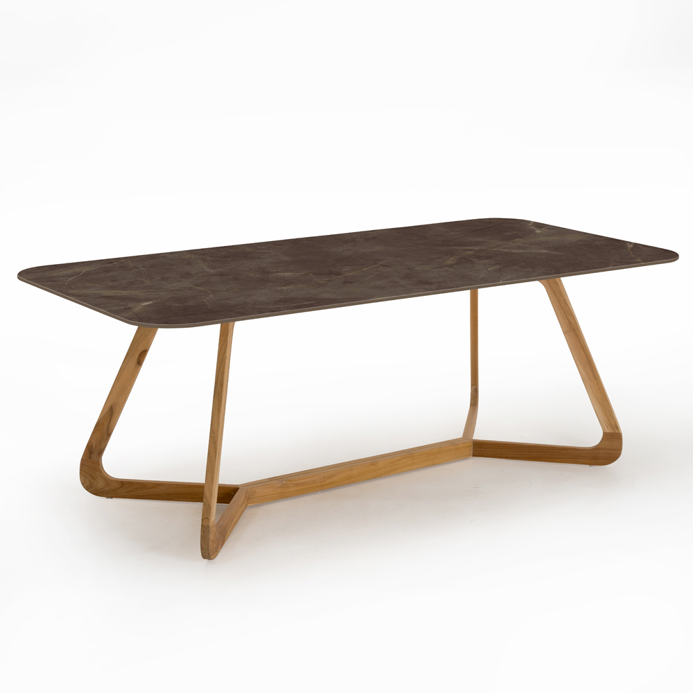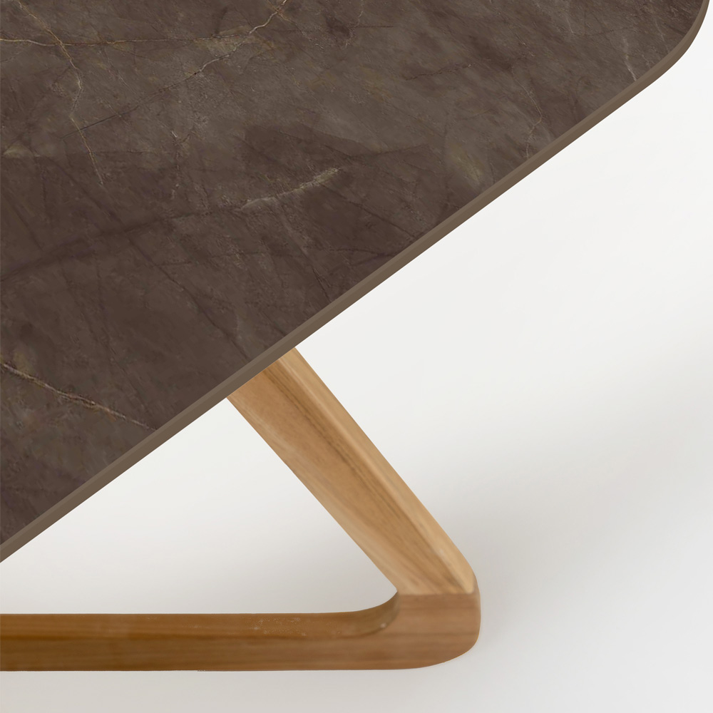 Made in Italy. This outdoor table with a Pulpis Brown ceramic top is a sophisticated design choice for those who want to bring a touch of earthy elegance to their outdoor space. The table combines a wooden base with a ceramic top that mimics Pulpis Brown marble, known for its deep brown color and subtle, lighter veining across the surface.