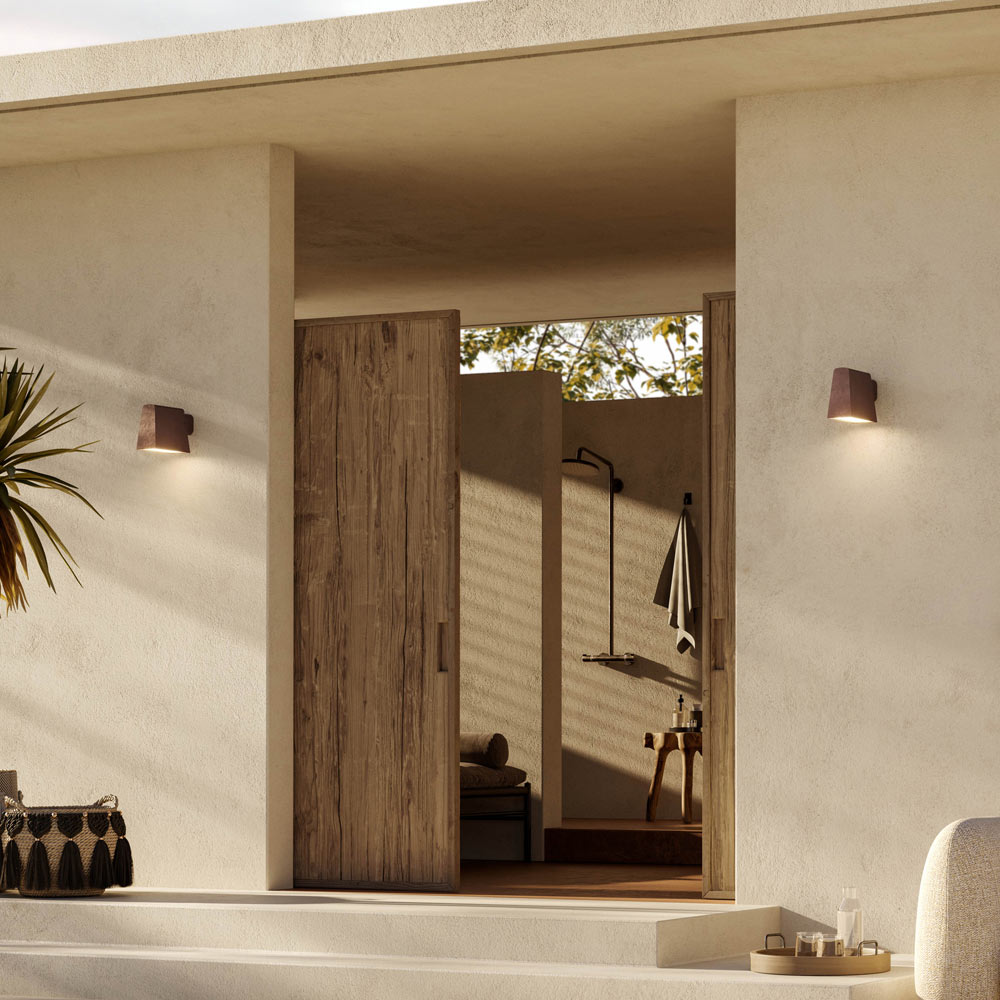 This outdoor wall light is designed to create comfortable and enveloping environments. Made of metal painted in antique brown, the material emphasizes the elegant color giving it a refined and vintage look. It is a piece of furniture with a strong aesthetic and functional union capable of delighting the outdoor experience.