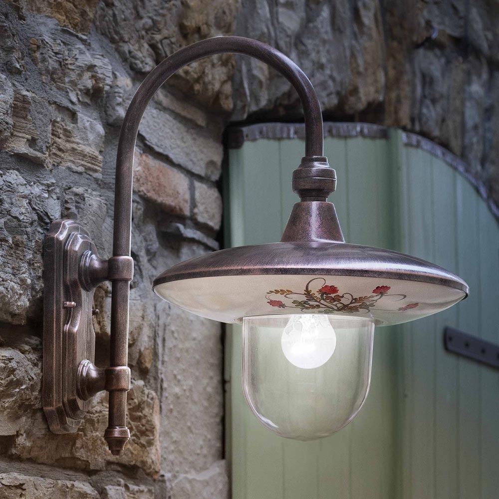 This outdoor wall lamp is entirely made of black aluminum with copper shading and decorated with hand-painted flowers for a classic and harmonious style between shape and colors.