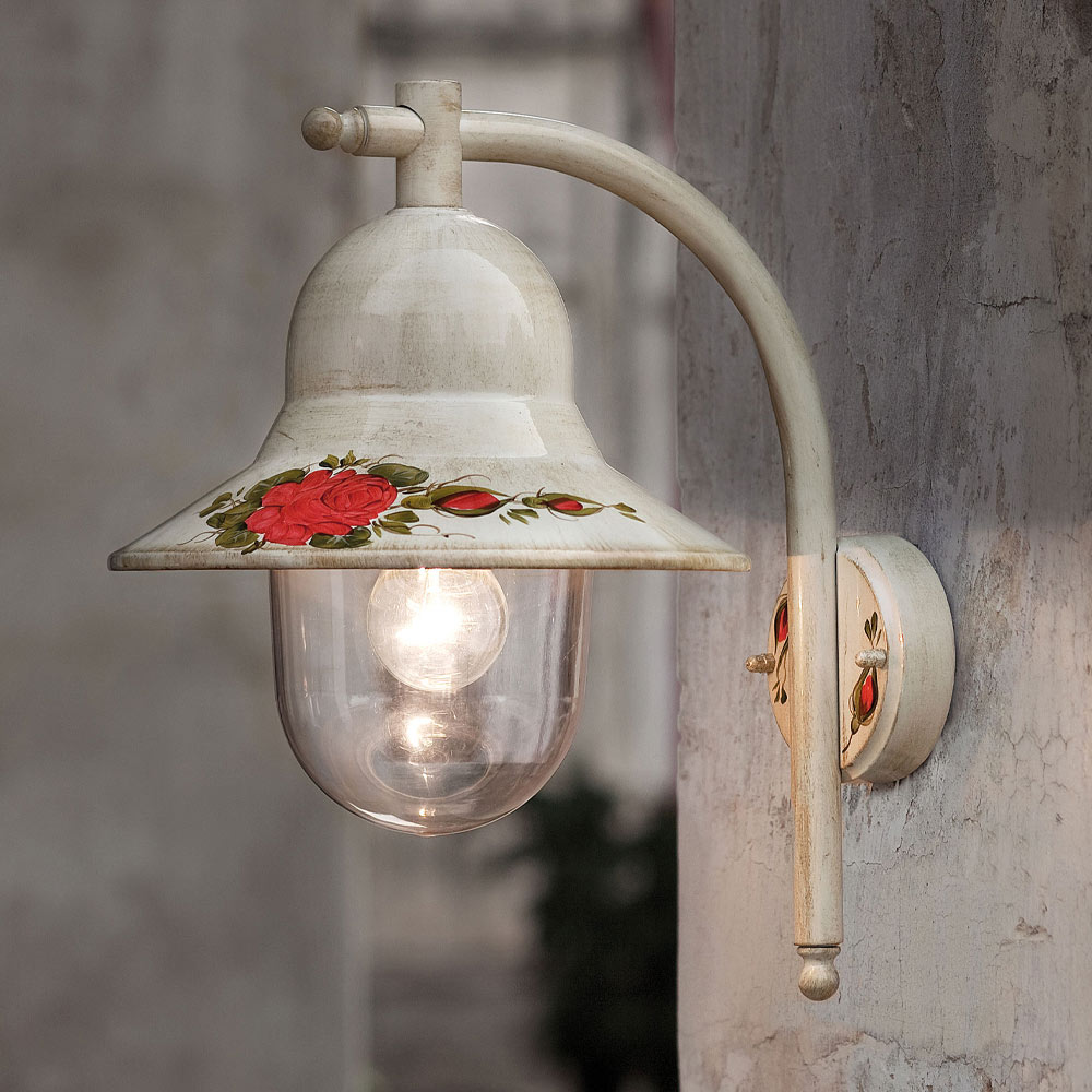This garden wall light is entirely made of shaded white aluminum and decorated with hand-painted flowers for a classic and harmonious style between shape and colors.