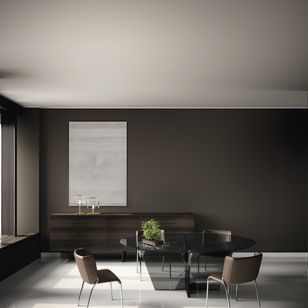 Characterized by an elegant and sculptural structure , this piece of furniture is born from the combination of materials of different nature together with the passion for glass processing, thus managing to define a representation of strength and character through different shapes and thicknesses.