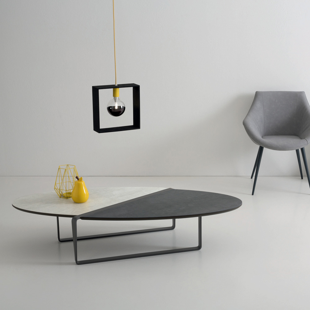 This oval designcoffee table features an embossed graphite powder coated metalbase and a two-tone matte ceramic top on panel. The peculiar feature of the complement is given by the top made in anthracite stone of savoy and pearl stone of savoy. A double finish for lovers of light and color. The metal structure separates and unites the two halves at the same time in a game of contrasts that gives life and character to the surrounding area.