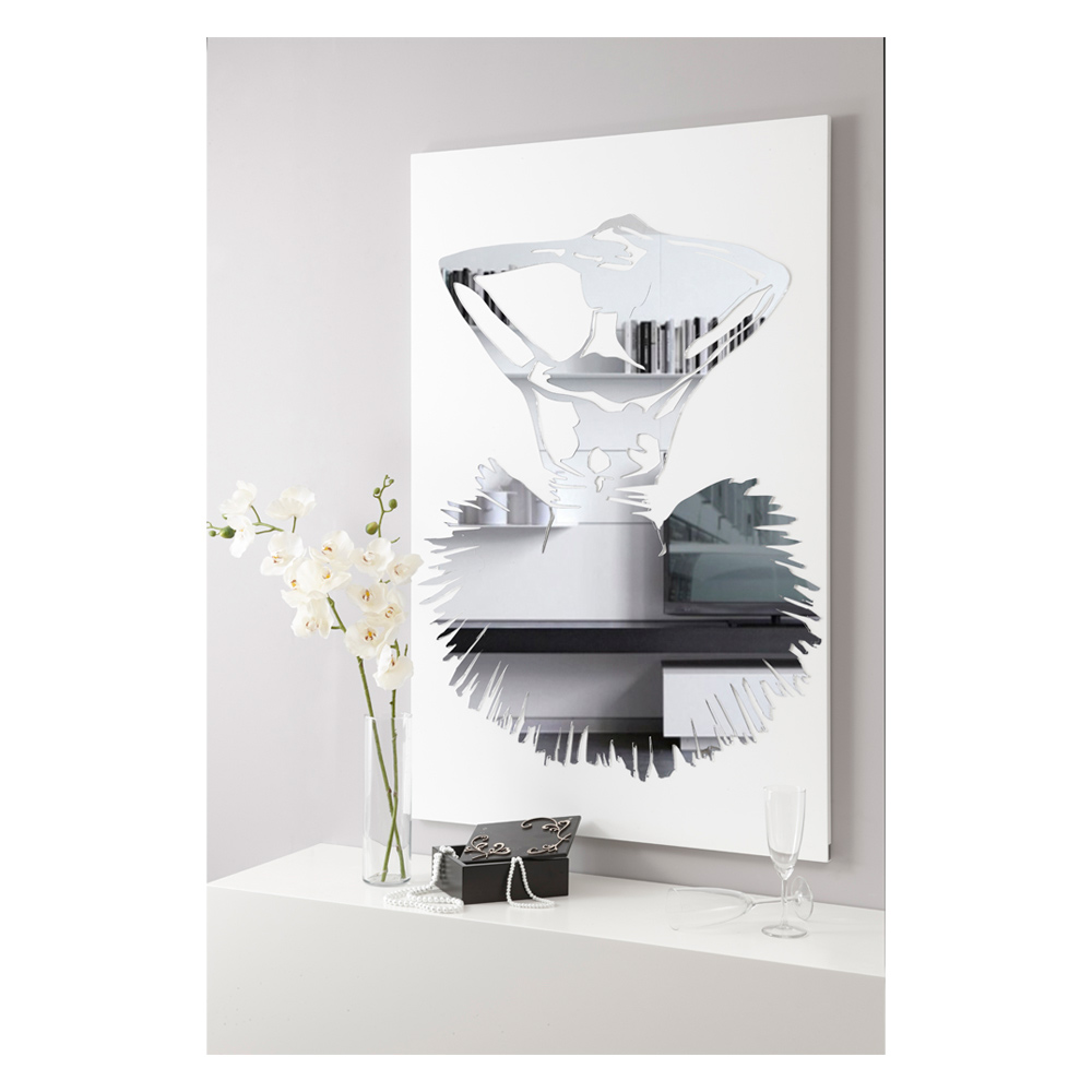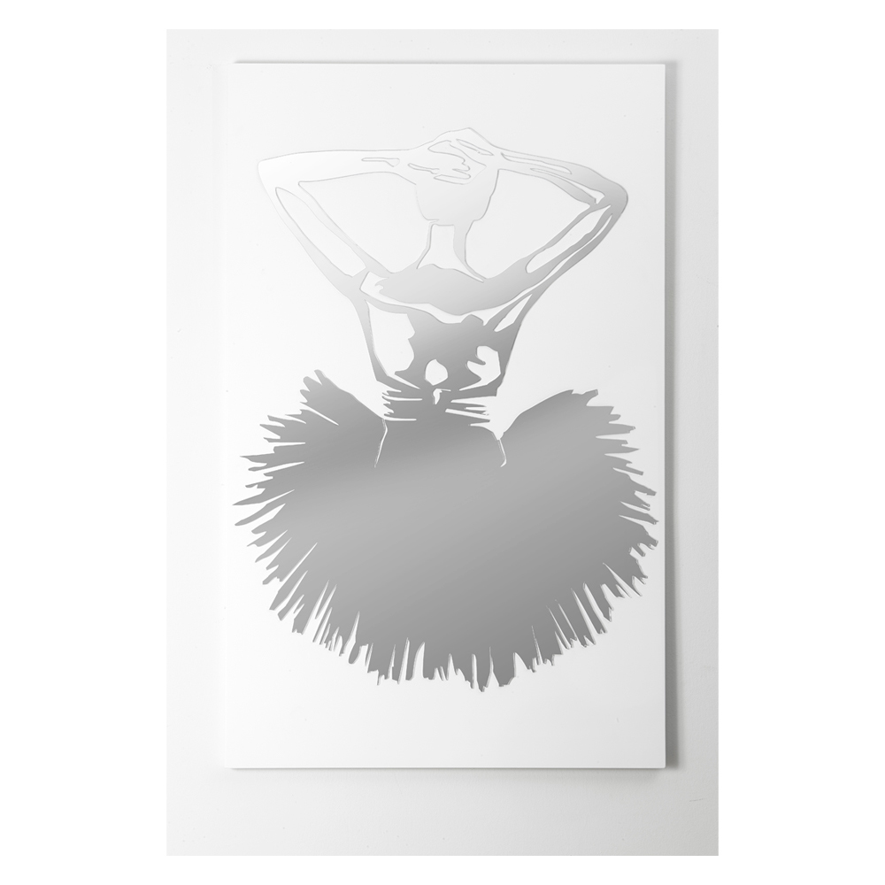 The decorative panel is made using the laser marking technique which creates a bas-relief on the material, creating different gradations of colour. The picture is made of white lacquered wood with mirror decoration. It represents a dancer made on mirror plexiglass in fact it has also function as a mirror.
