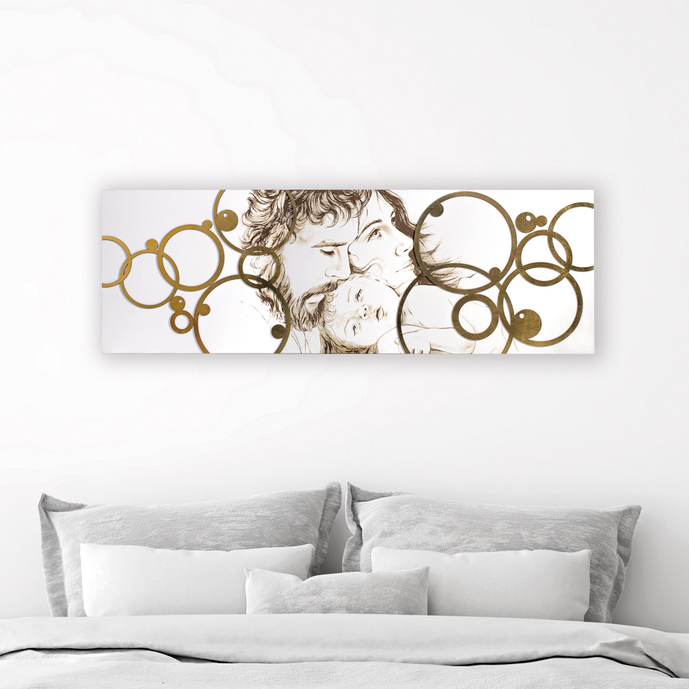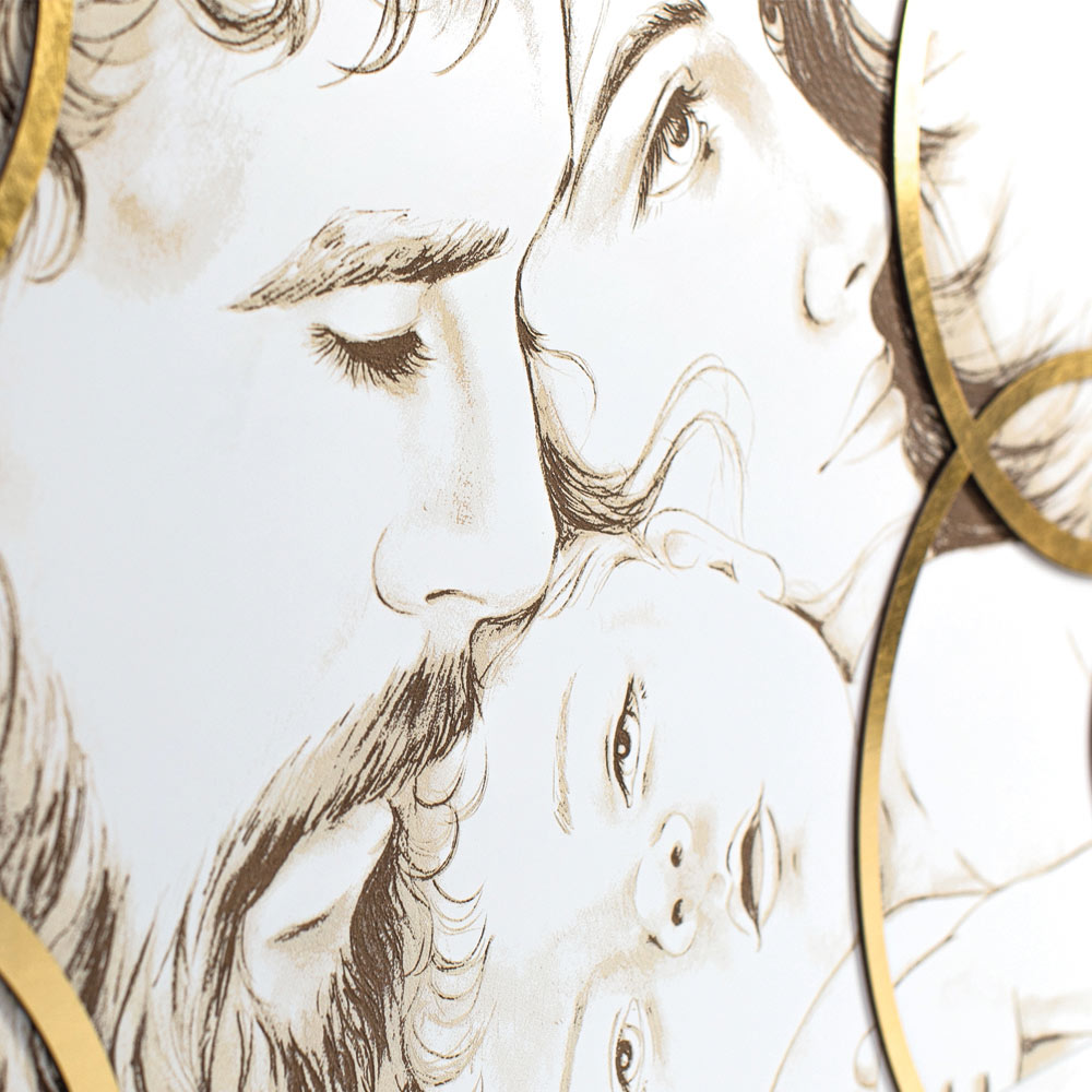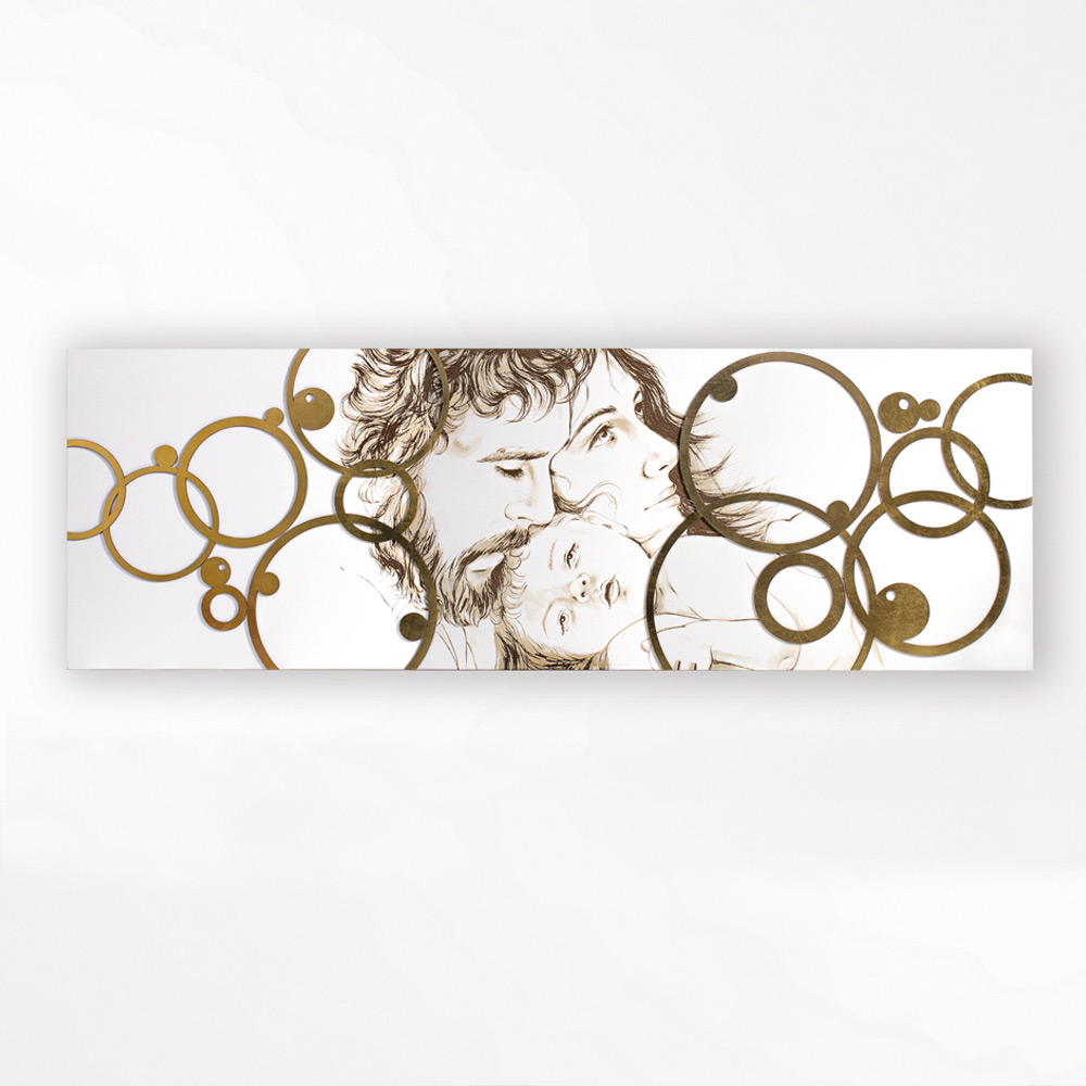 The panel represents the Holy Family in a modern style . Gold leaf decorations are applied to the laser marked design. Matt white lacquered wooden panel with laser marking, a special technique that creates a bas-relief on the materials. The applications are made in gold leaf , a special precious technique.