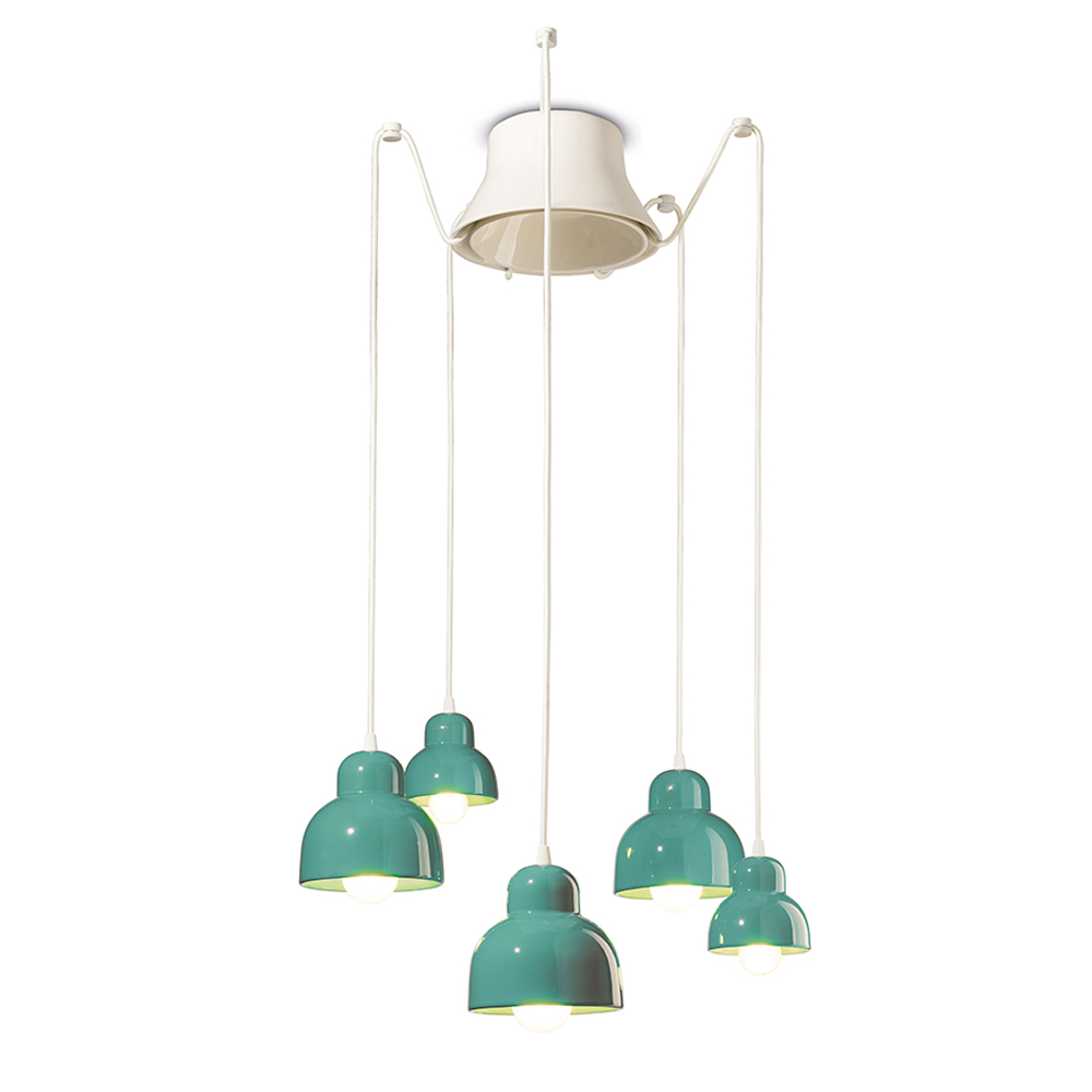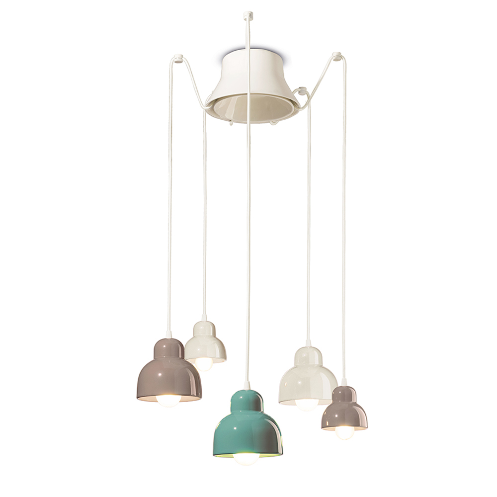 This ceramic pendant lamp is a charming example of contemporary design inspired by tradition . Its five pendant lights radiate at different heights, like a visual dance of shapes and lights in space.
