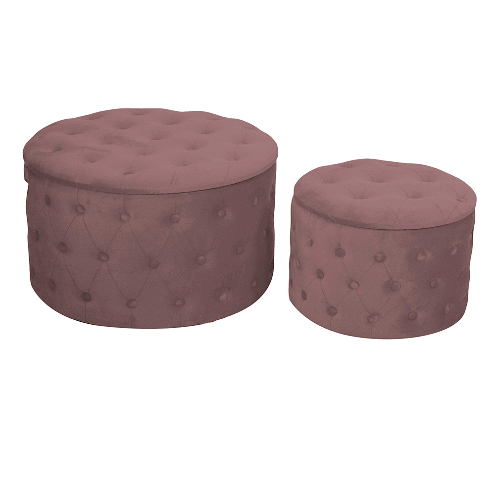 This set of storage ottomans is the perfect complement to combine elegance and functionality in any room of the house. Covered in a sophisticated velvet , these ottomans stand out for their buttoned capitoné design, which adds a touch of class and sophistication to your living room, bedroom or entryway.