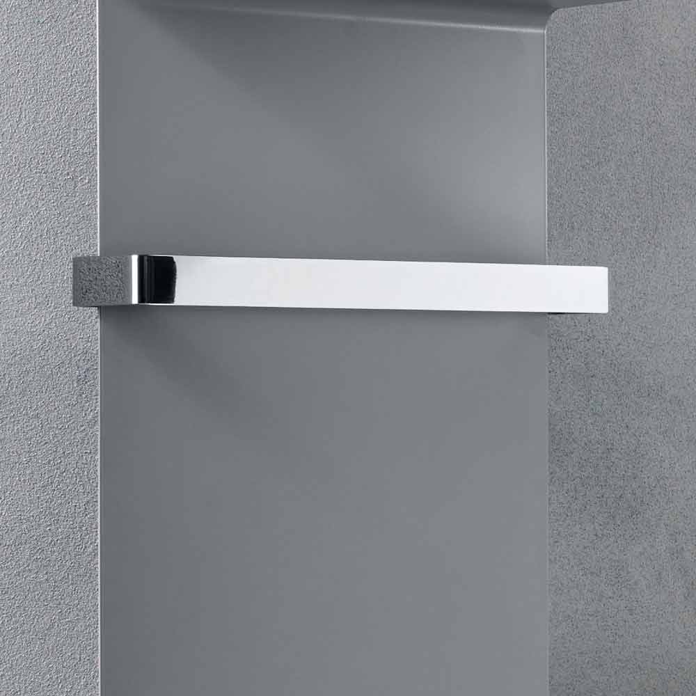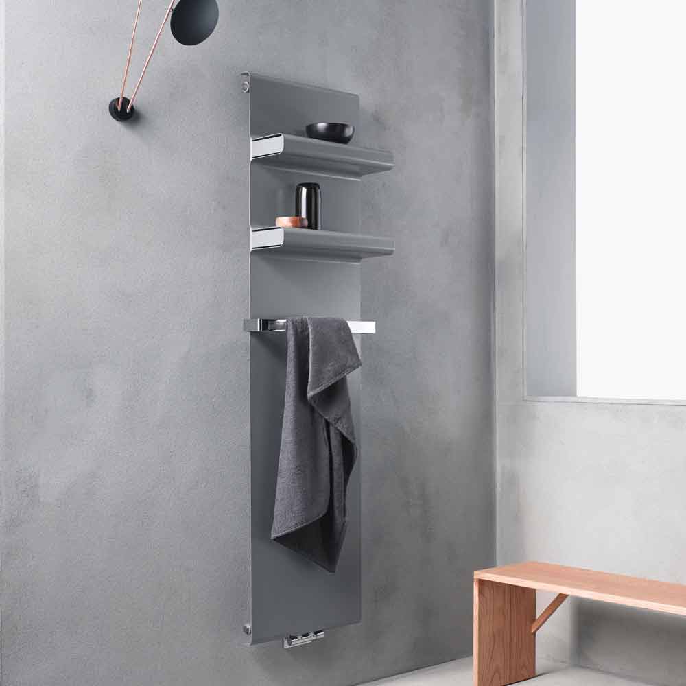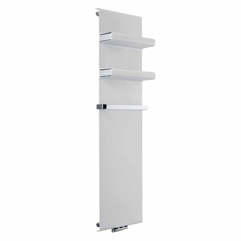 hydraulic radiant plate features a modern and minimal design with practical and elegant integrated shelves with cover included and chrome towel bar, which extends the radiator width by 4 cm.