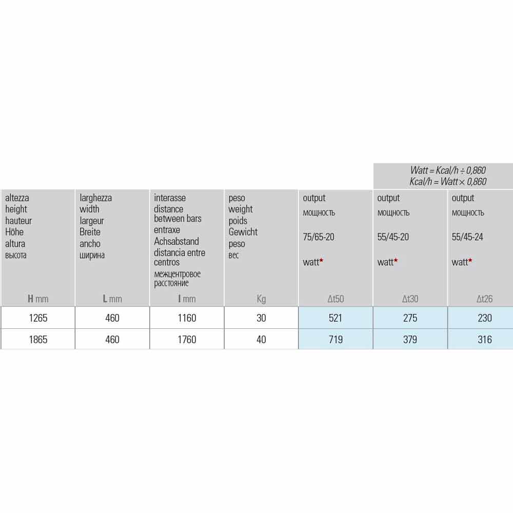 Available in different sizes *:- H 1265 x L 460 x Inter. 1160 mm x Output w (Δt50 *) 521; Yield w (Δt30 *) 275; Output w (Δt26 *) 230 (1 shelf);