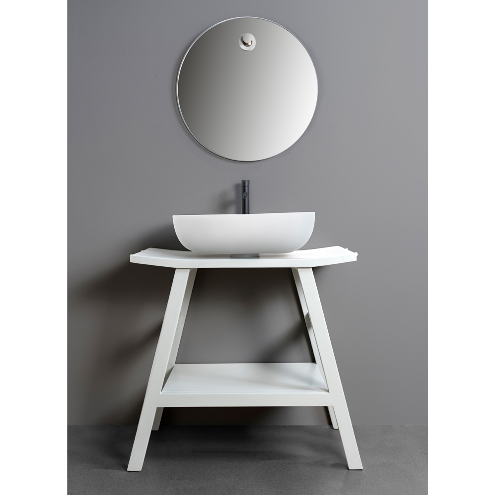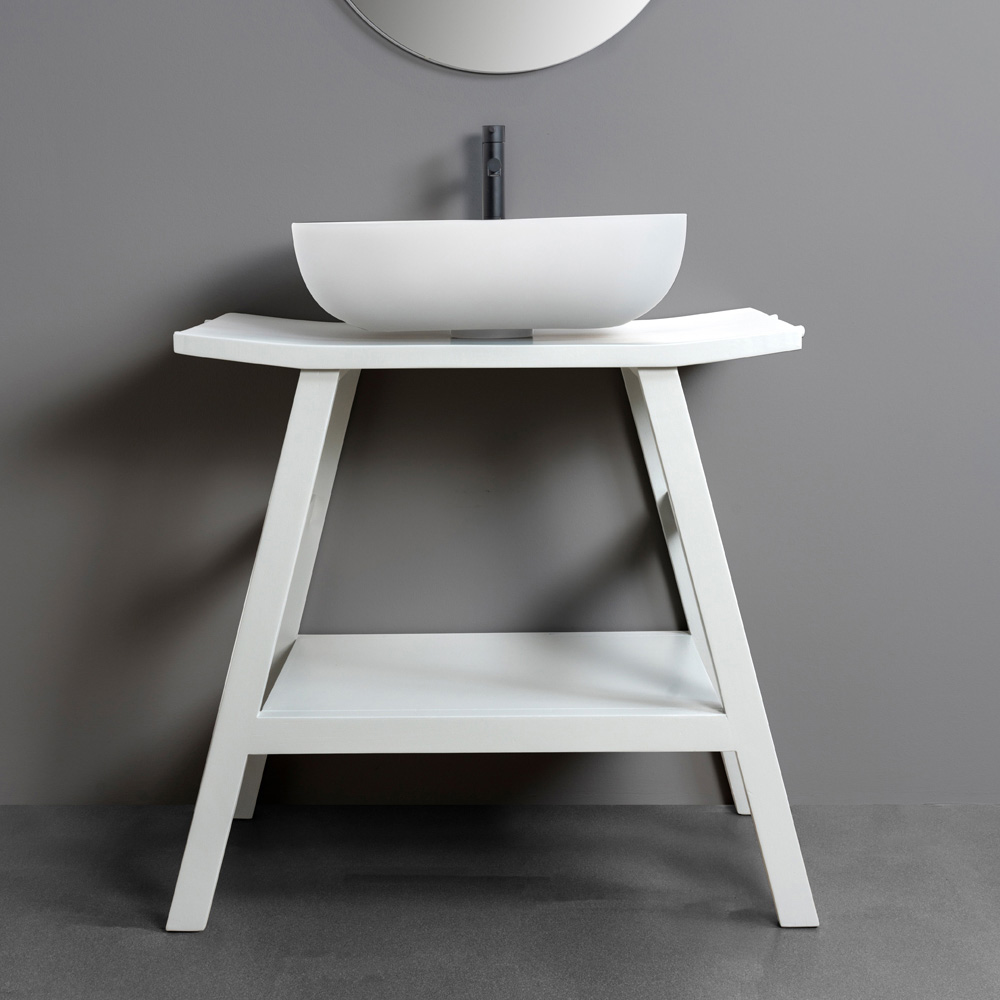 Free -standing bathroom cabinet made of natural recovered teak matt white painted, a pure and elegant shade that recalls the dazzling reflection of snow in the sun and perfectly matches the teak wood for a result with a strong scenographic personality. Its structure is characterized by the slightly curved shape of the top that offers an exclusive and refined touch to the aesthetics of the product. Complete with 4 practical towel hooks and functional storage shelf .