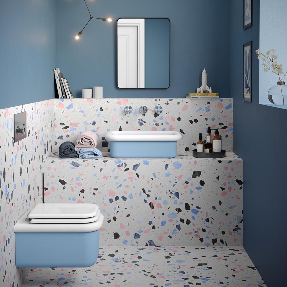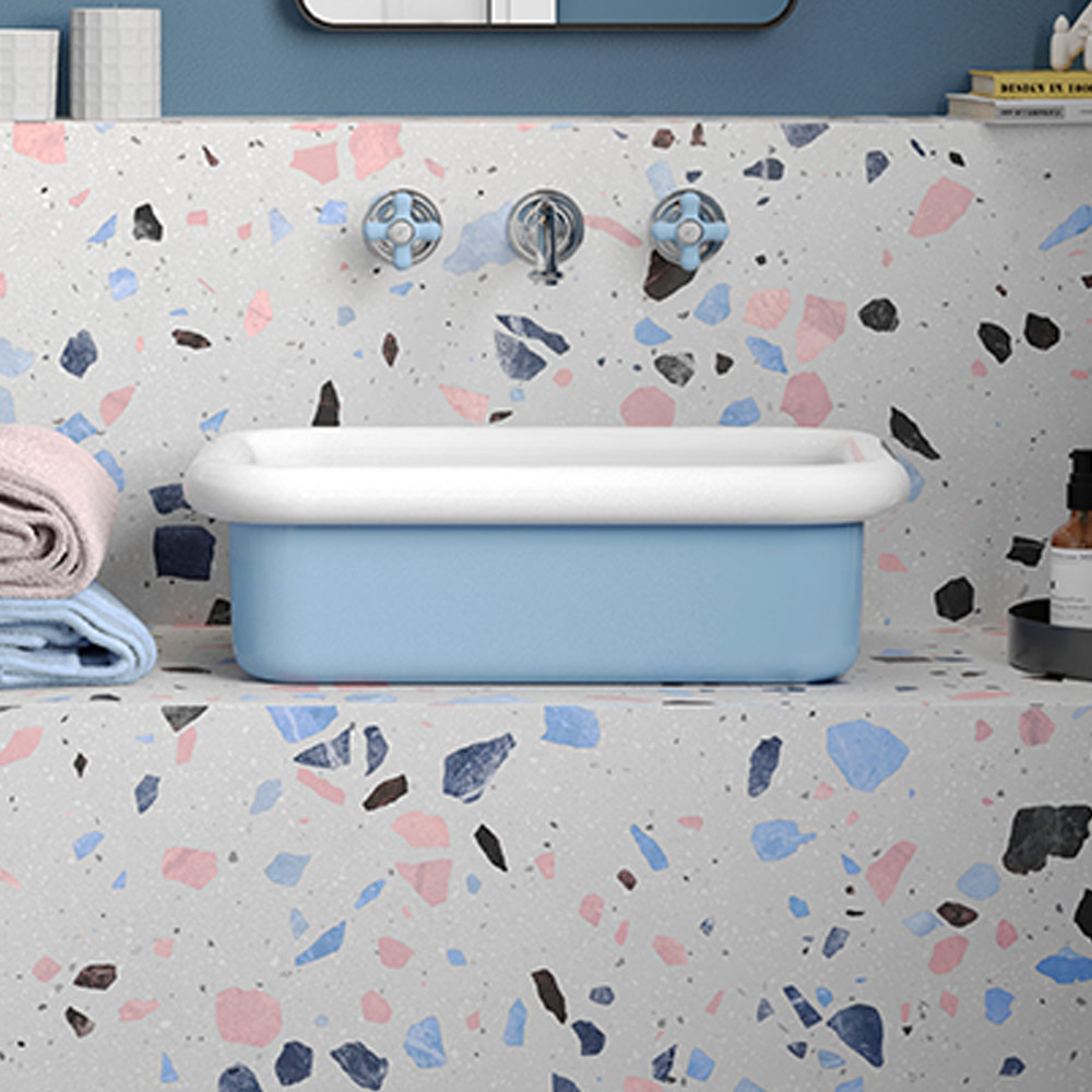 Bathroom washbasin with rectangular structure on top in two-tone ceramic , white or pastel blue or matt black.