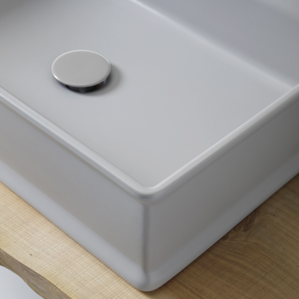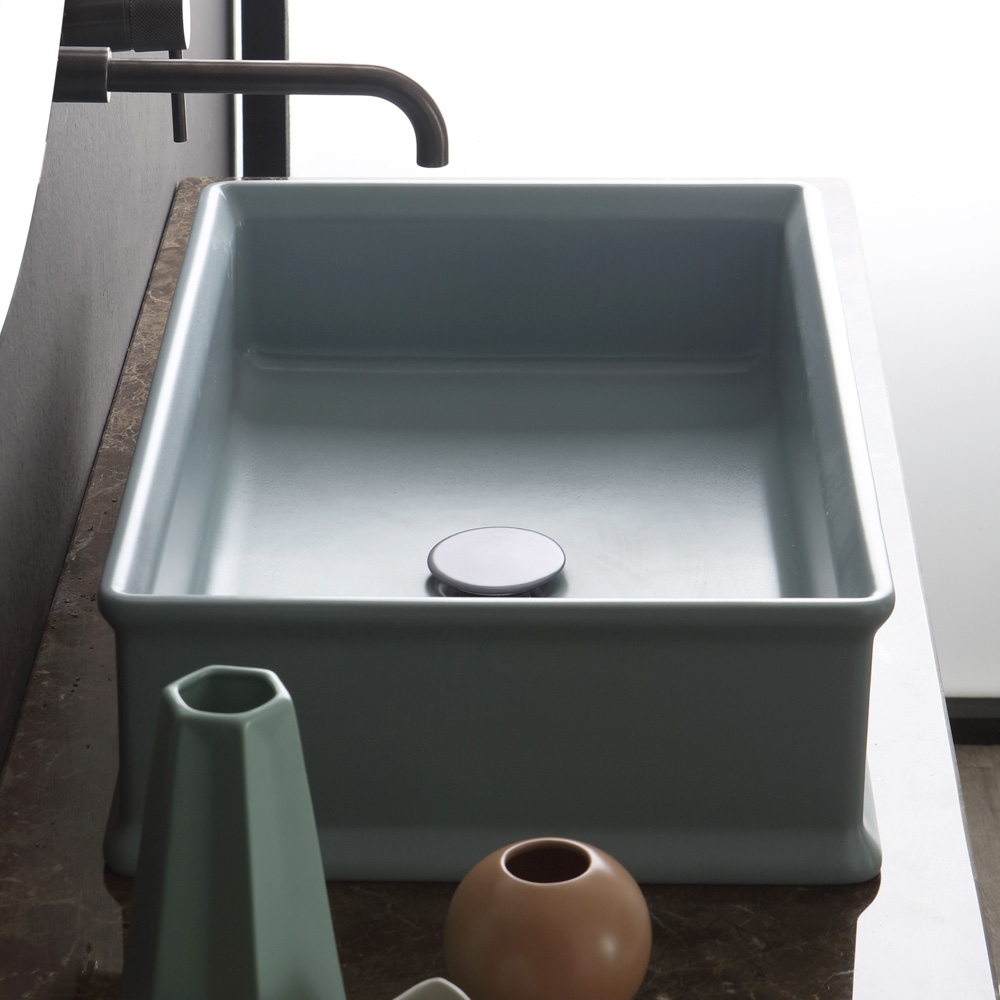 Rectangular countertop washbasin made of opaque colored ceramic through a 100% Made in Italy craftsmanship . A design characterized by strong and imposing lines and features makes this piece of furniture a perfect contemporary reinterpretation of an aesthetic with a retro soul thanks to the use of color giving life to an exclusive and refined result .