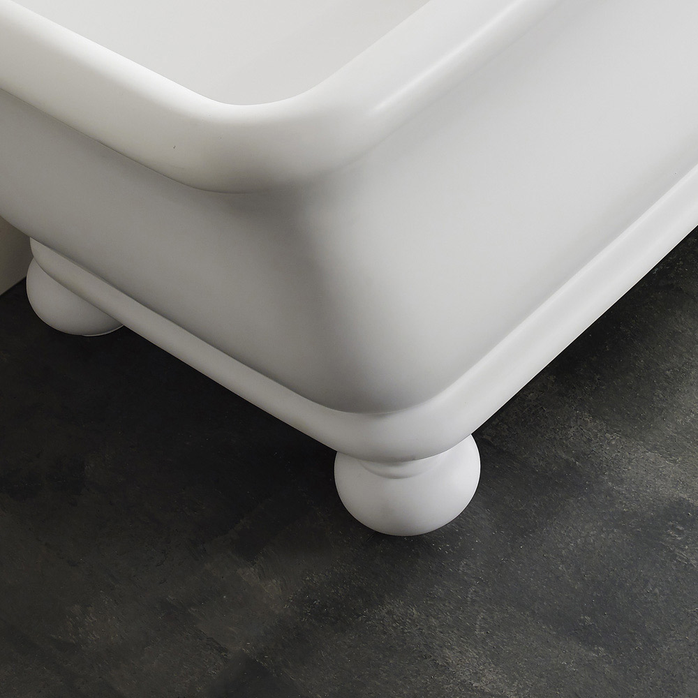 Rectangular white bathtub in Solid Surface, a mixture of acrylic resin modified with mineral compounds, with overflow for waste column. Original 4-foot raised bathtub in optional solidsurface . Choice of matt or glossy white. The composition mixture allows this characteristic color to come out. This mixture is also highly renewable, homogeneous and 100% non-porous and therefore waterproof.