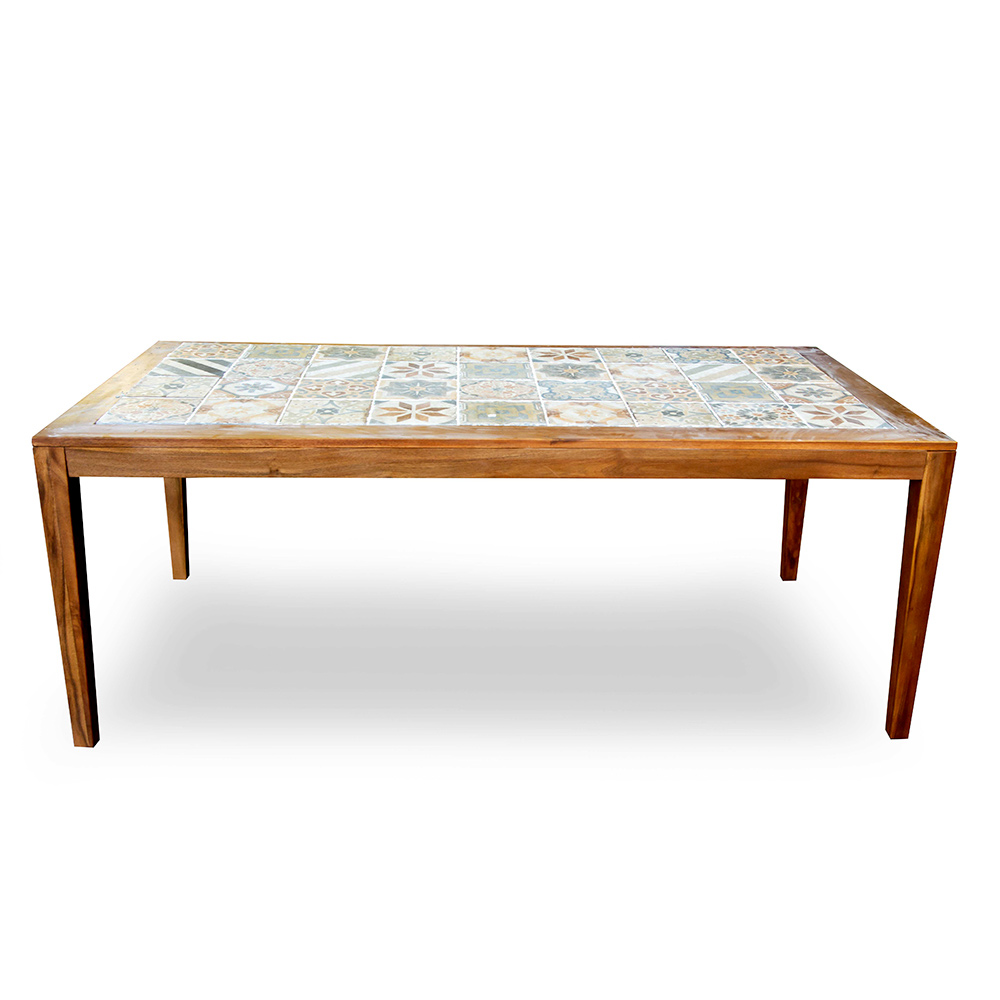 Discover the dining table that combines rustic elegance and traditional art in one exclusive piece of furniture. This beautiful table features a decorated ceramic top, harmoniously set in a solid wooden structure . Each tile is carefully selected to create a mosaic that evokes artisan traditions, making it a unique and fascinating piece.