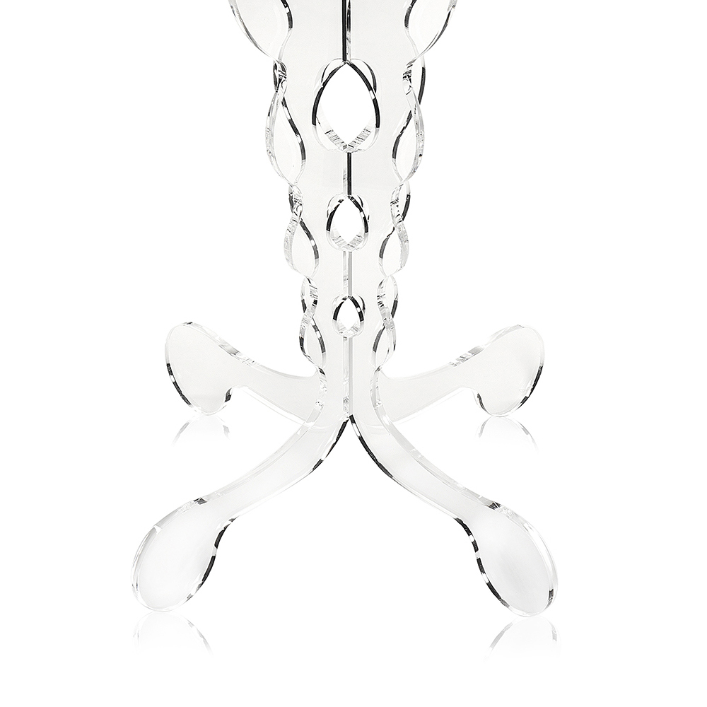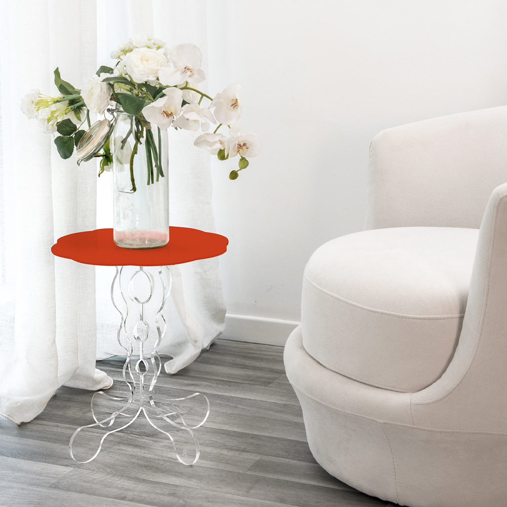 A moorish design characterises the Janis table, which can be used both as a coffee table or as a bedside table. The table base is made of laser-shaped 100% PMMA plexiglass. The table top gives a touch of color to the environment.