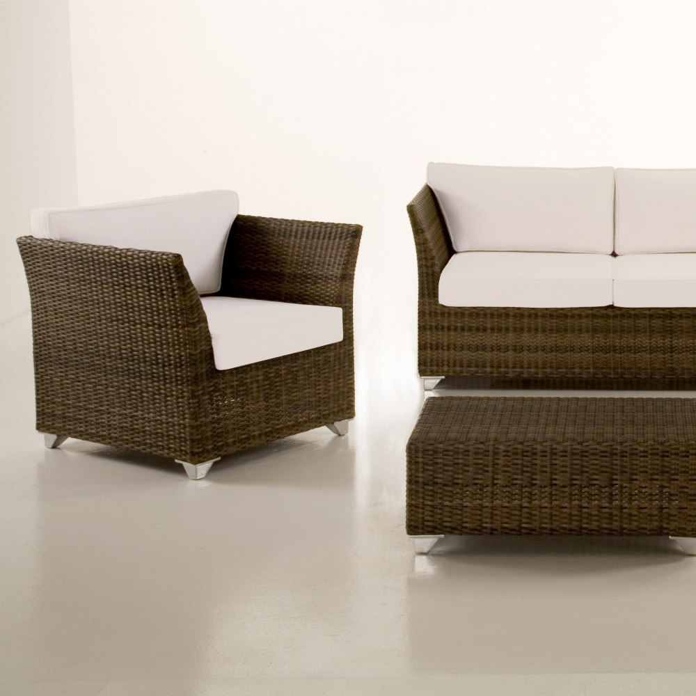 The poly rattan frame adds a touch of resistance and durability against the elements, maintaining its beauty over time. The matching coffee table is the ideal complement to host drinks and snacks, making it the perfect set for your guests and for your outdoor evenings.