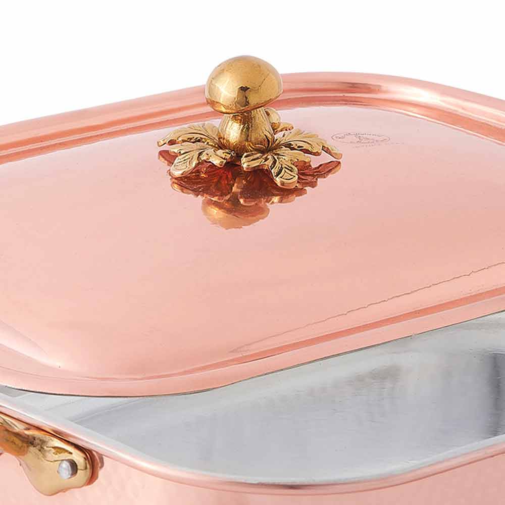 Rectangular copper roaster with brass lid and handles, made in Italy craftsmanship.