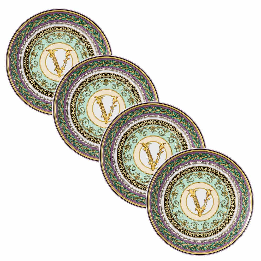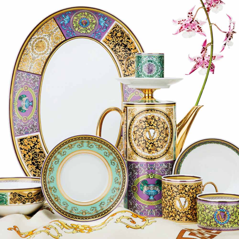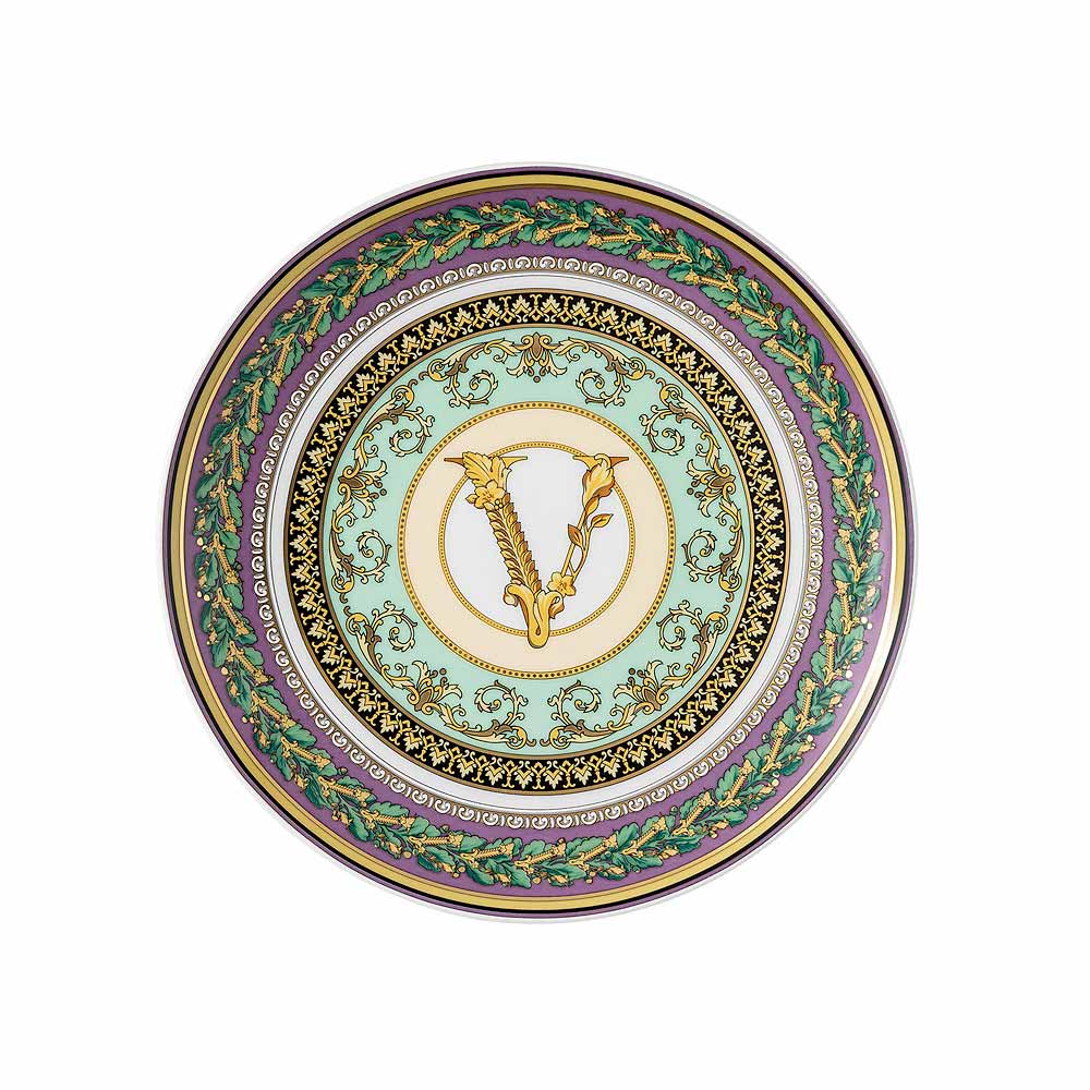 The Barocco Mosaic bread plate by Versace , in precious porcelain , is a combination of classic elegance and contemporary design. Its unique design highlights the "V" Virtus symbol, surrounded by ornamental details in sparkling gold and pastel shades that create a sophisticated and captivating effect.