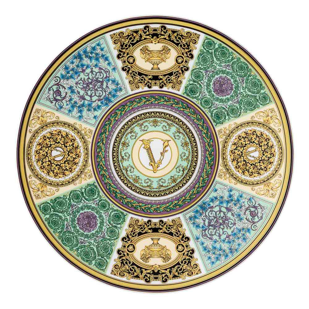 The Barocco Mosaic placemat by Versace , crafted from fine porcelain , is a true masterpiece of Italian art and design . This unique piece masterfully combines a series of iconic motifs from the maison, including the legendary Medusa , baroque ornaments and intricate mosaics in bright colours. Its refined aesthetic and golden details create an effect of absolute opulence and sophistication .