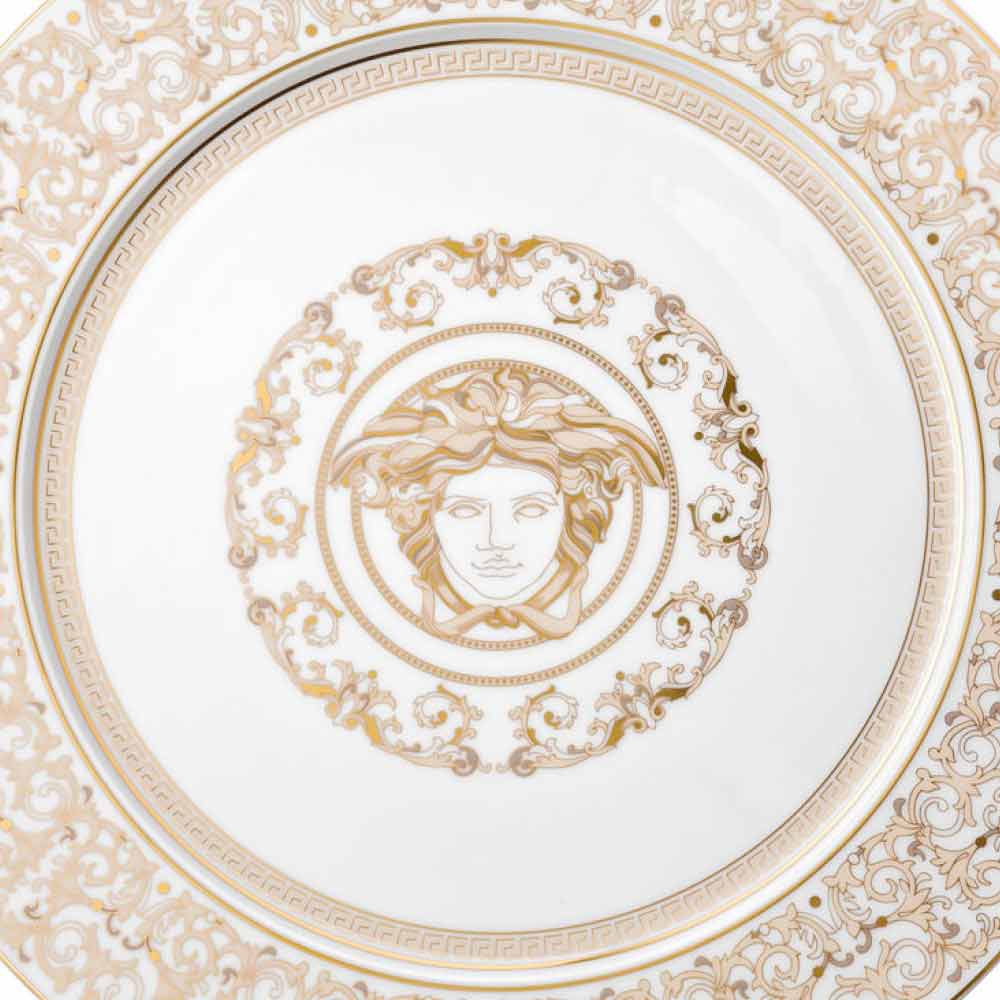 Rosenthal Versace Medusa Gala Placeholder Plate 33cm in Porcelain The fabulous 33cm place card plate by Versace is part of the refined and luxurious Medusa Gala table collection. Inspired by the opulence and unique atmosphere of gala dinners, Medusa Gala reinterprets the traditional Versace motifs in design and decoration: the iconic depiction of the Medusa alternates with refined baroque ornaments in a precious gold filigree. An exciting contrasting effect between the whiteness of the porcelain and the pure gold gives life to a perfect mise en place, modern and at the same time unique. Enriched with motifs and decorations entirely in gold, Medusa Gala comes in an even more luxurious "Gold" version, perfect for integrating and further embellishing the table.
