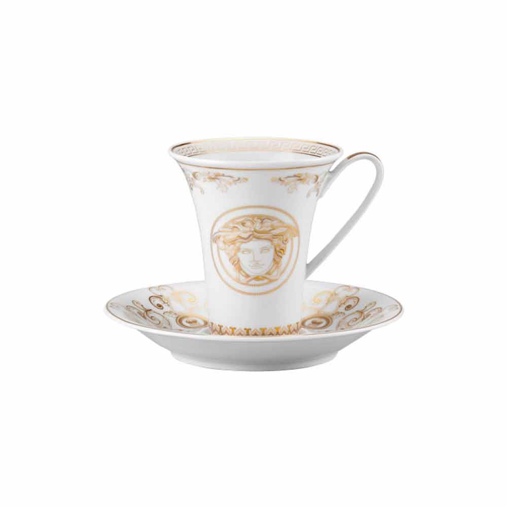 Rosenthal Versace Medusa Gala Tall Design Porcelain Coffee Cup The fantastic and designer tall coffee cup including saucer by Versace is part of the refined and luxurious Medusa Gala table collection. Inspired by the opulence and unique atmosphere of gala dinners, Medusa Gala reinterprets the traditional Versace motifs in design and decoration: the iconic depiction of the Medusa alternates with refined baroque ornaments in a precious gold filigree. An exciting contrasting effect between the whiteness of the porcelain and the pure gold gives life to a perfect mise en place, modern and at the same time unique. Enriched with motifs and decorations entirely in gold, Medusa Gala comes in an even more luxurious "Gold" version, perfect for integrating and further embellishing the table.