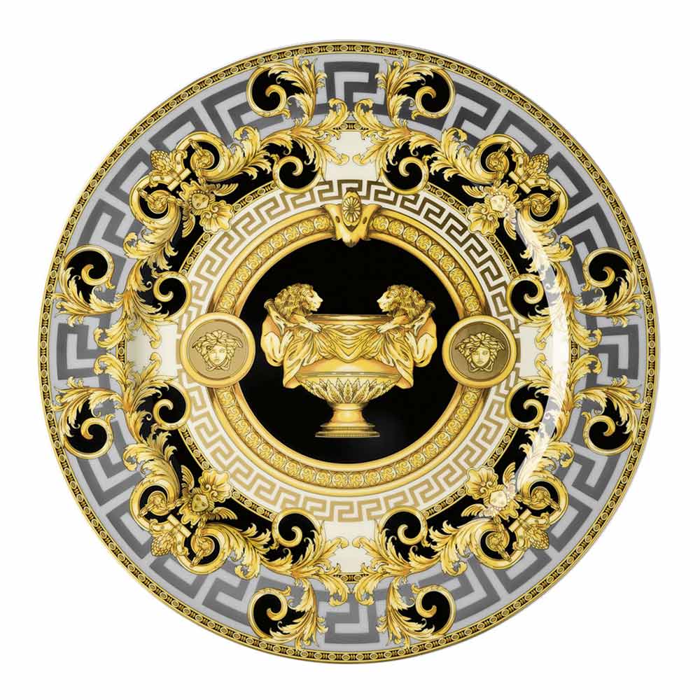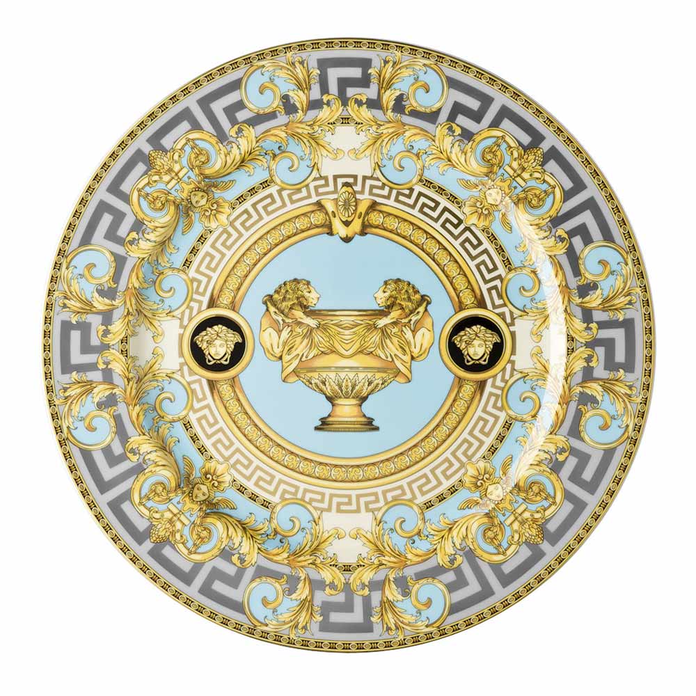 The Prestige Gala place card plate by Versace , made of refined porcelain , is an authentic tribute to classic elegance and timeless luxury. The extraordinary design is dominated by a splendid golden amphora , a symbol of royalty and majesty, at the center of a frame embellished with the classic Greek motif and baroque floral details in gold. Available in two background variations, black and light blue, this plate offers a sophisticated contrast that elevates every mise en place.