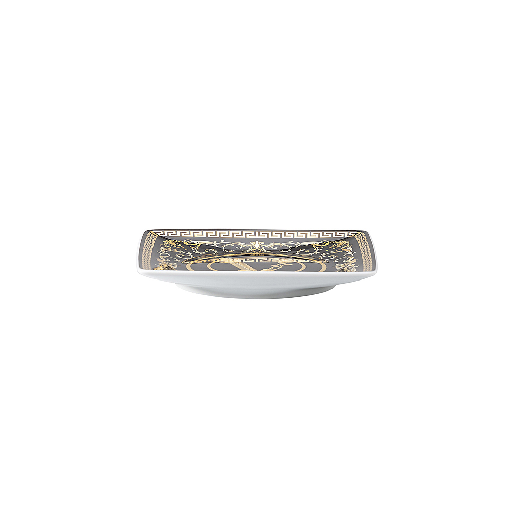 The Virtus Gala flat square cups by Versace are the perfect combination of sophisticated design and functionality. Made of fine porcelain , they stand out for their elegant glossy background embellished with baroque-style gold details, which include the iconic Versace "V" symbol, an emblem of timeless style and luxury .