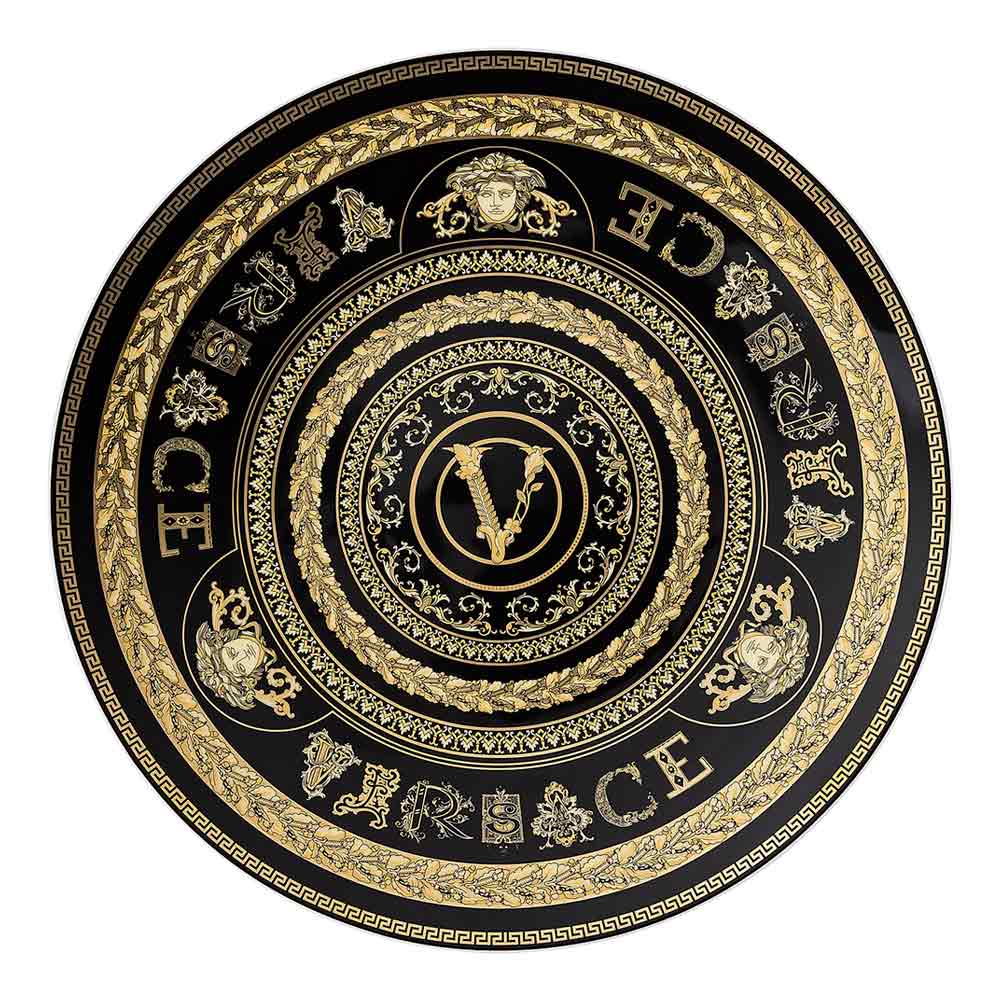 The Virtus Gala placemat by Versace is a true celebration of luxury and refinement , crafted from precious porcelain . Its distinctive design combines glossy color with visually striking gold decorations , enriched with baroque details and the iconic Versace "V" logo, a symbol of timeless elegance.